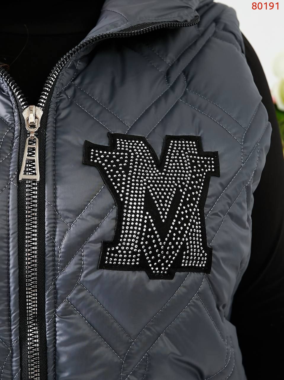 Стильна стегана жилетка прямого крою з кишенями, зручний глибокий капюшон, декорована нашивкою в камінні, якісна фурнітура.