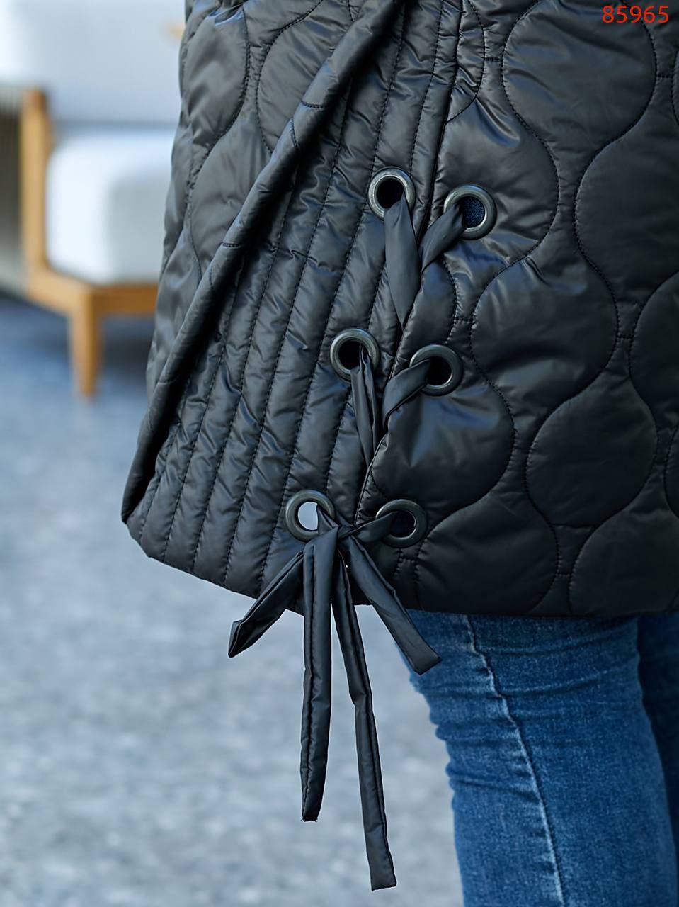 Стильна стегана жилетка цікавого крою із зав'язками з боків, зручний глибокий капюшон, якісна фурнітура, нашивка