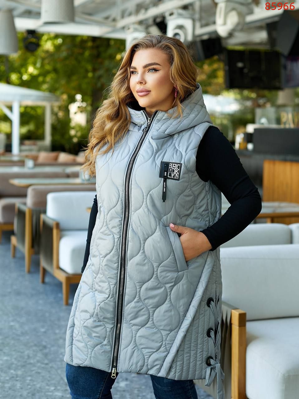 Стильна стегана жилетка цікавого крою із зав'язками з боків, зручний глибокий капюшон, якісна фурнітура, нашивка