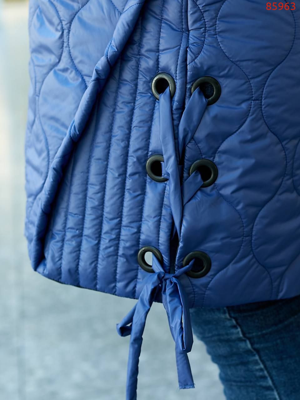 Стильна стегана жилетка цікавого крою із зав'язками з боків, зручний глибокий капюшон, якісна фурнітура, нашивка
