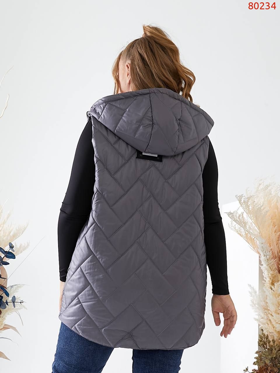 Стильна стегана жилетка з кишенями, зручний глибокий капюшон, якісна фурнітура.