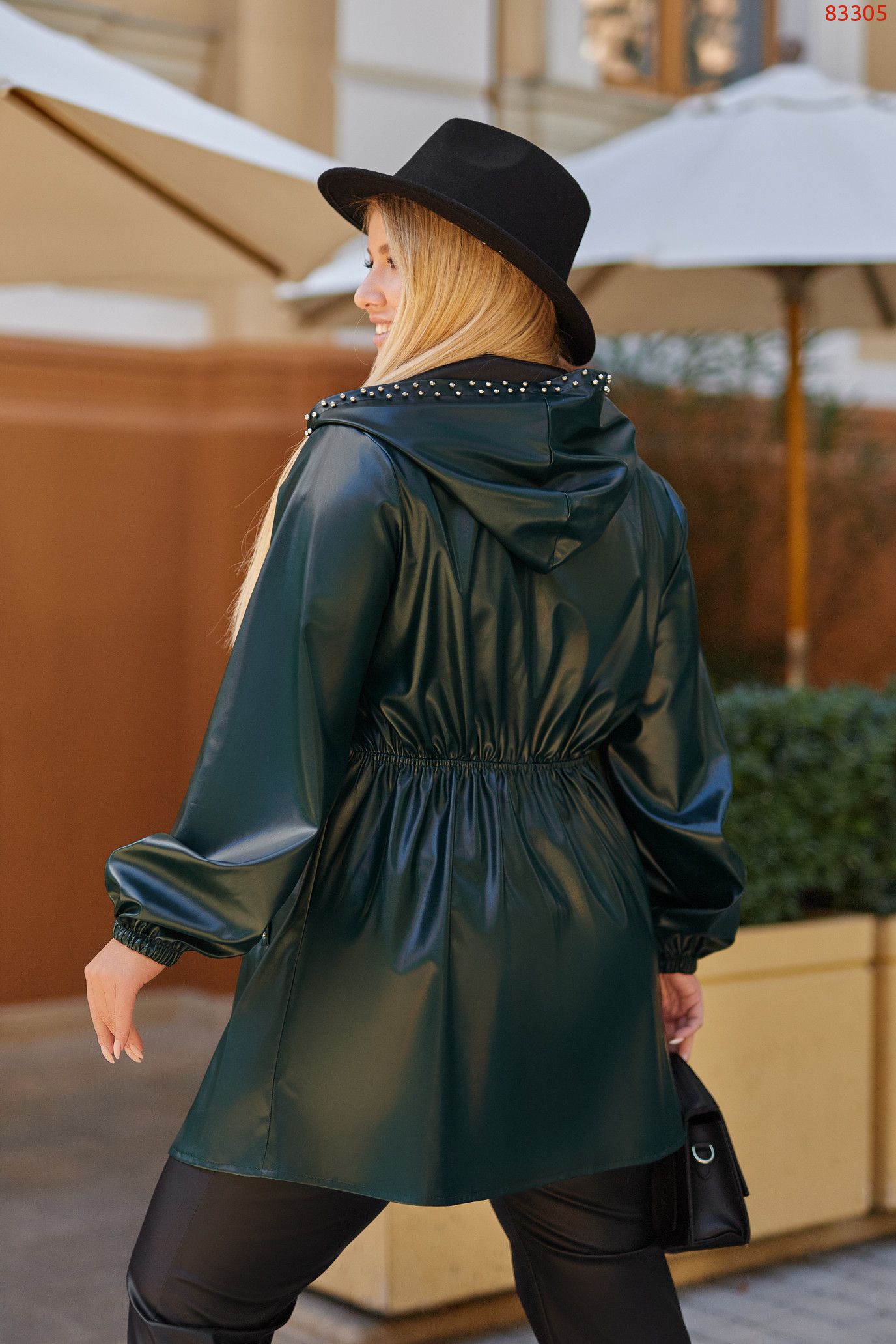 Еко шкіра гарної якості, спереді, по капюшоні та кишенях оформлено перлинами, добре тримаються на гвоздиках, зроблені на спеціальному обладнанні.