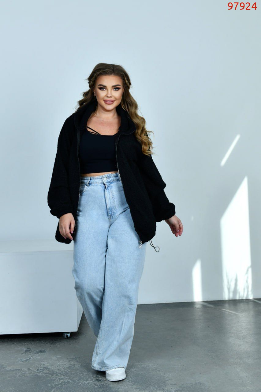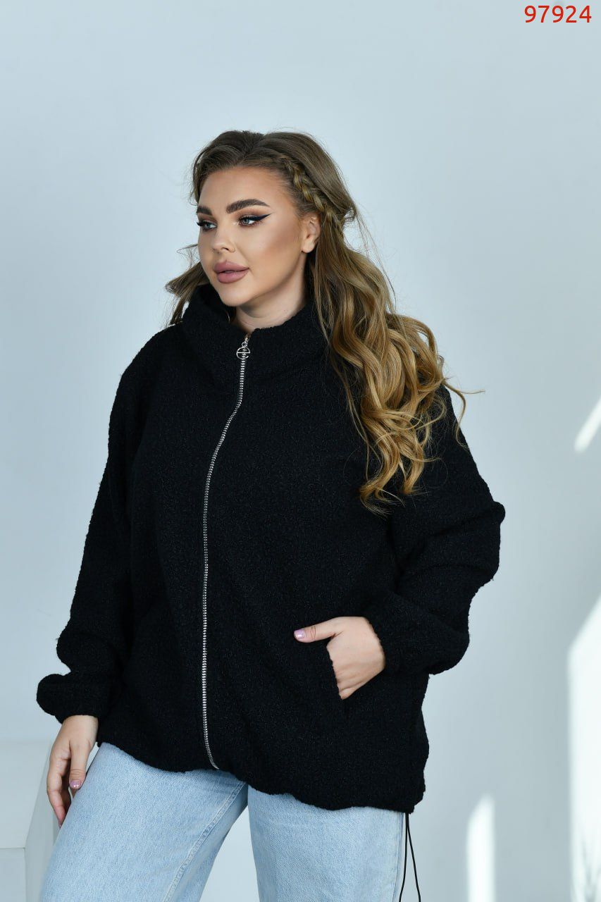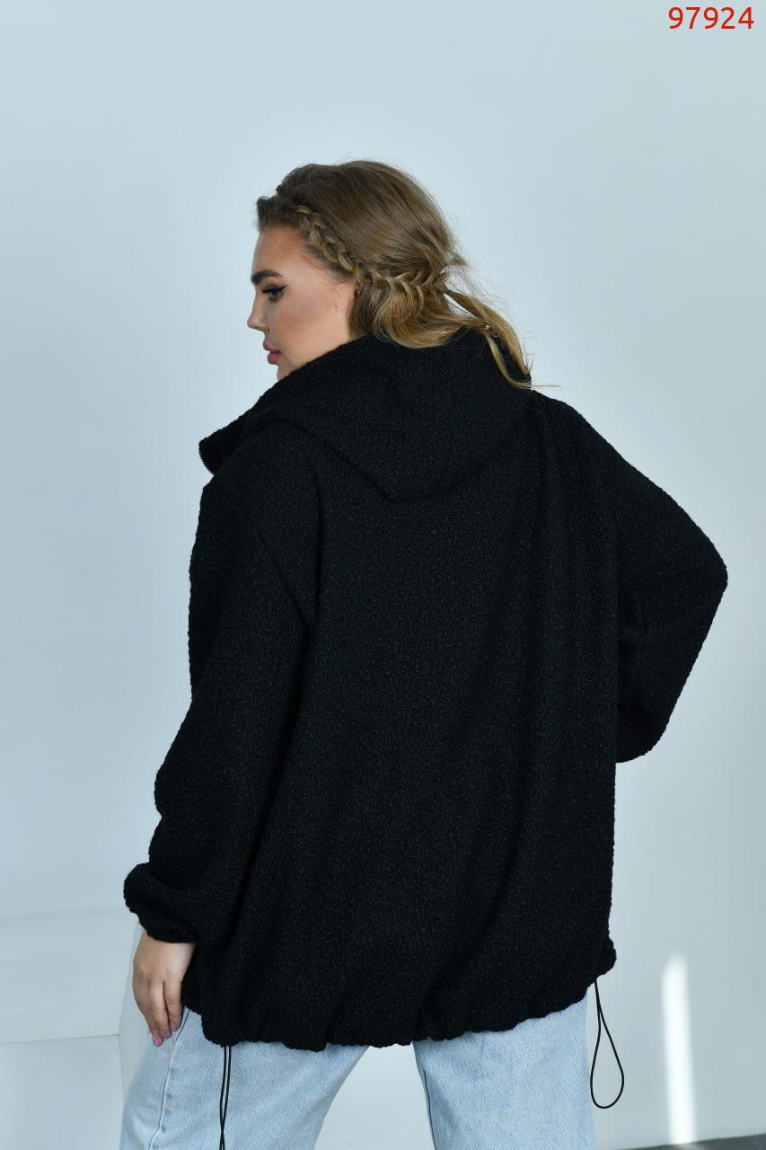Стильна куртка вільного силуету із якісного буклє «баранець» ( розтяжність мінімальна). Лінія плеча спущена, рукав на резинці. Капюшон зі стійкою, щоб краще захищати горло під час вітряної погоди. Куртка застібається на блискавку. Низ на кулісці з резинкою та стопорами, щоб можна було затягувати. Попереду оброблені кишені. Без підкладки.