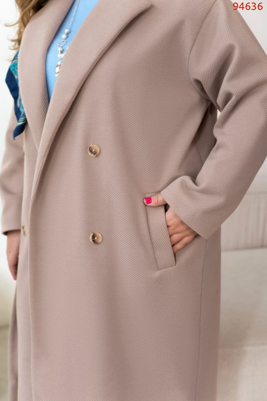 Стильне монохромне двобортне пальто oversize ідеально впишеться як в строгий діловий стиль, так і в актуальні образи в стилі casual. Воно буде ідельно поєднуватися з елегантними брюками, спідницями і сукнями, а також з комфортними спортивними костюмами та кросівками. Модель на підкладці доповнена довгими рукавами з приспущеною лінією плечей, відкладним коміром і зручними кишенями.