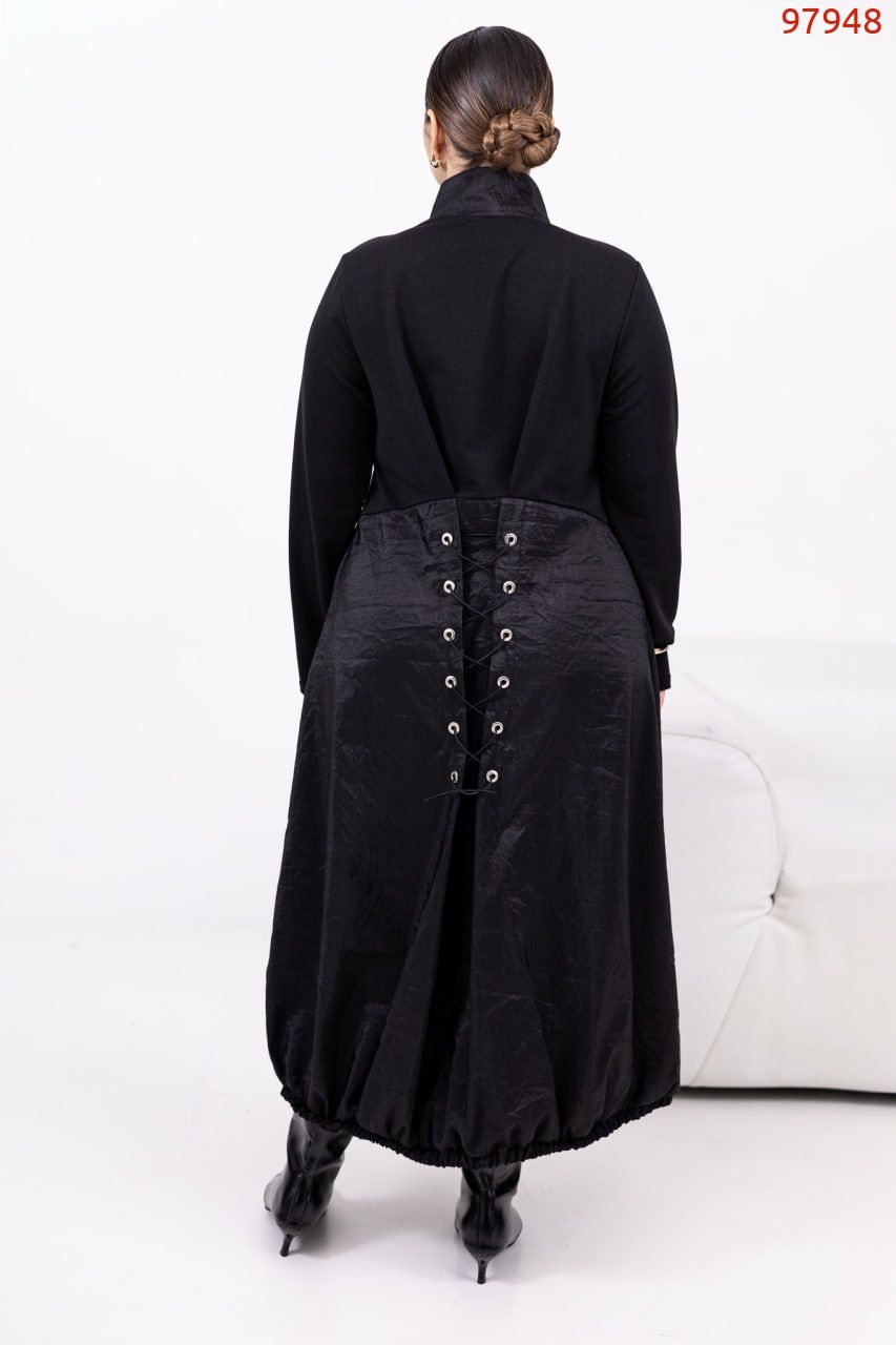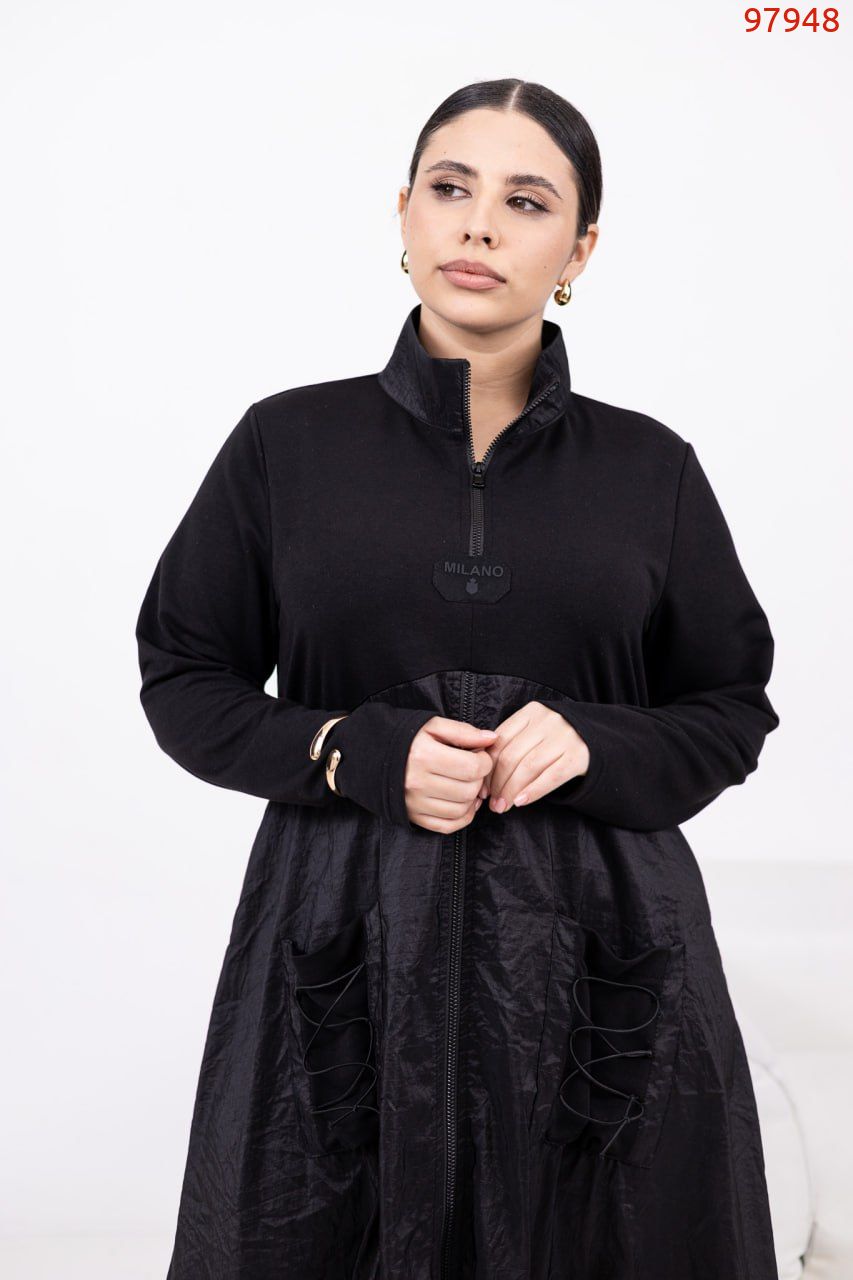 Легка елегантність з акцентом на комфорт: спортивні деталі зустрічаються з міським шиком. Стійка-горловина з блискавкою до рівня грудей + окрема блискавка від грудей донизу, комбінована фактура (двонитка + жатa плащівка), дві накладні кишені. Ззаду – декоративна шнурівка для регулювання об’єму на талії. Низ на резинці для охайної посадки.