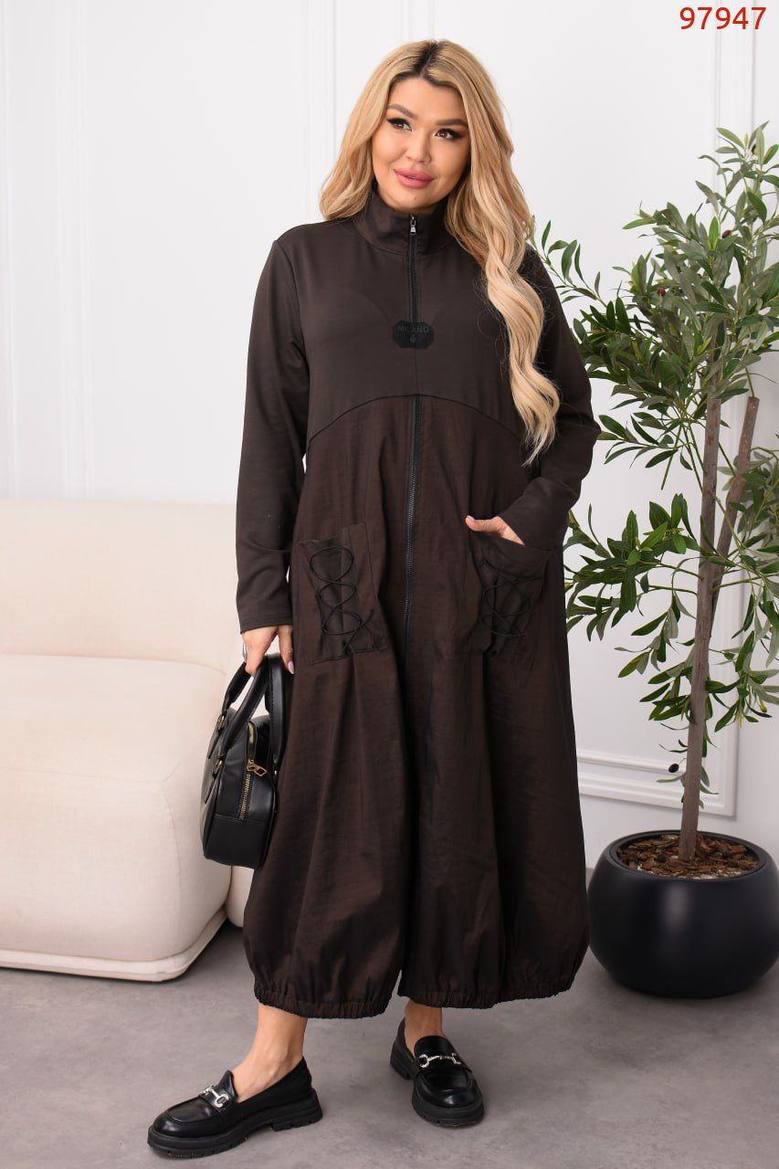 Легка елегантність з акцентом на комфорт: спортивні деталі зустрічаються з міським шиком. Стійка-горловина з блискавкою до рівня грудей + окрема блискавка від грудей донизу, комбінована фактура (двонитка + жатa плащівка), дві накладні кишені. Ззаду – декоративна шнурівка для регулювання об’єму на талії. Низ на резинці для охайної посадки.