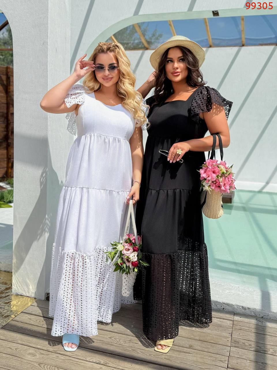 Стильна літня сукня. Сукня максі-довжини, вільного крою з завищеною талією. Верх має квадратний виріз і короткі рукави-ліхтарики з перфорованої тканини.