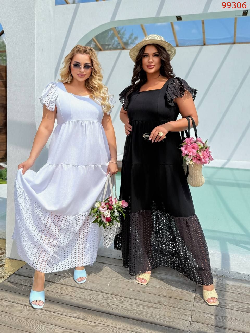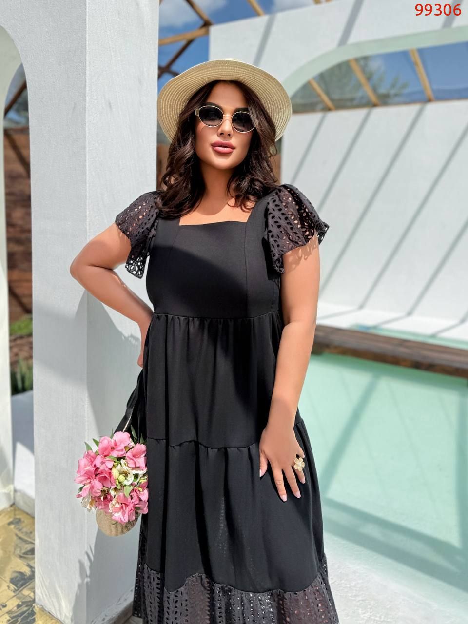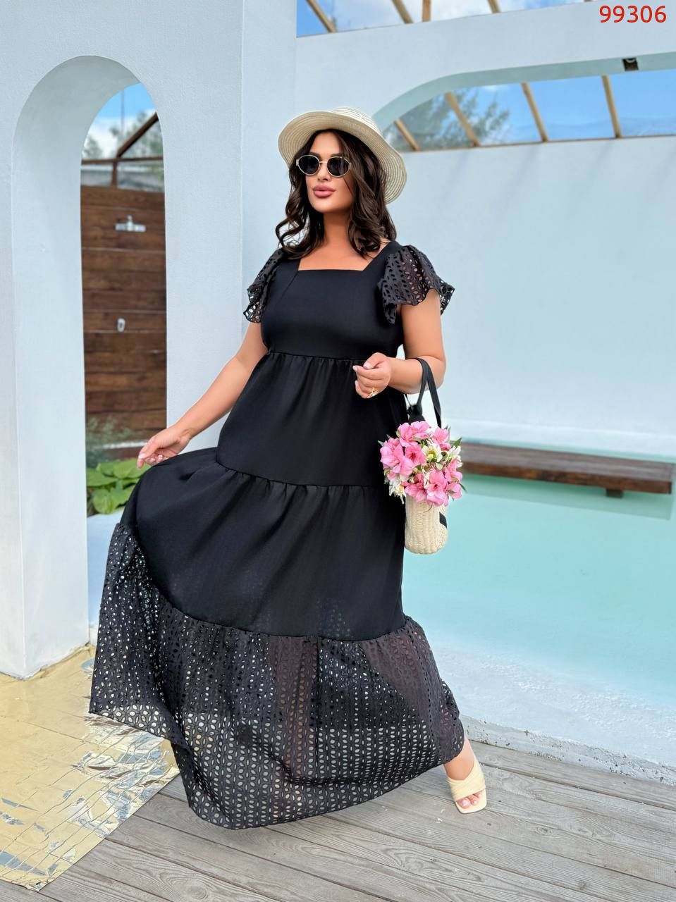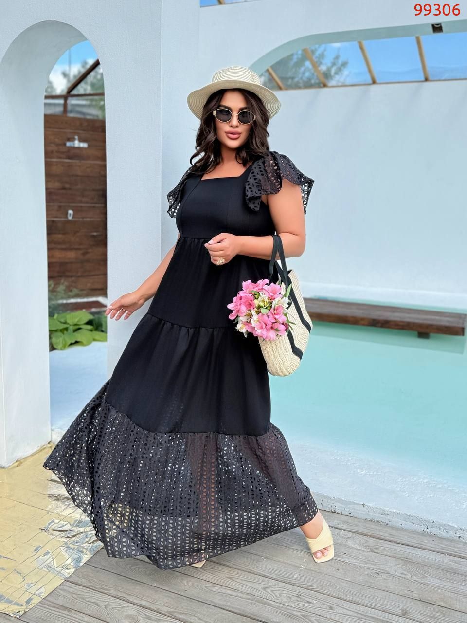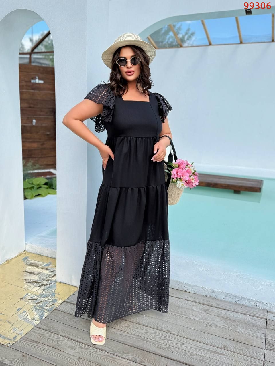 Стильна літня сукня. Сукня максі-довжини, вільного крою з завищеною талією. Верх має квадратний виріз і короткі рукави-ліхтарики з перфорованої тканини.