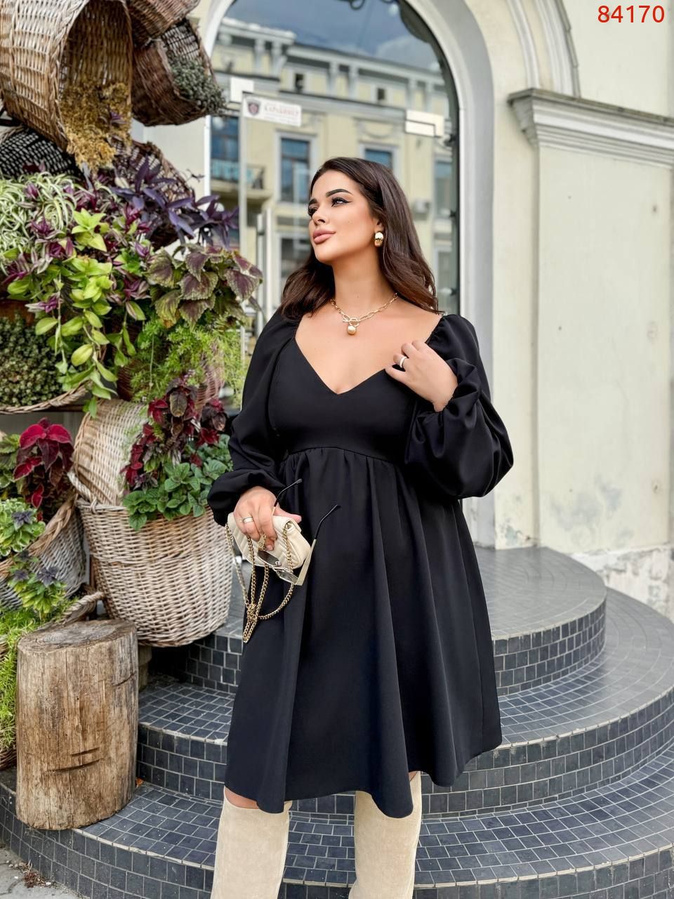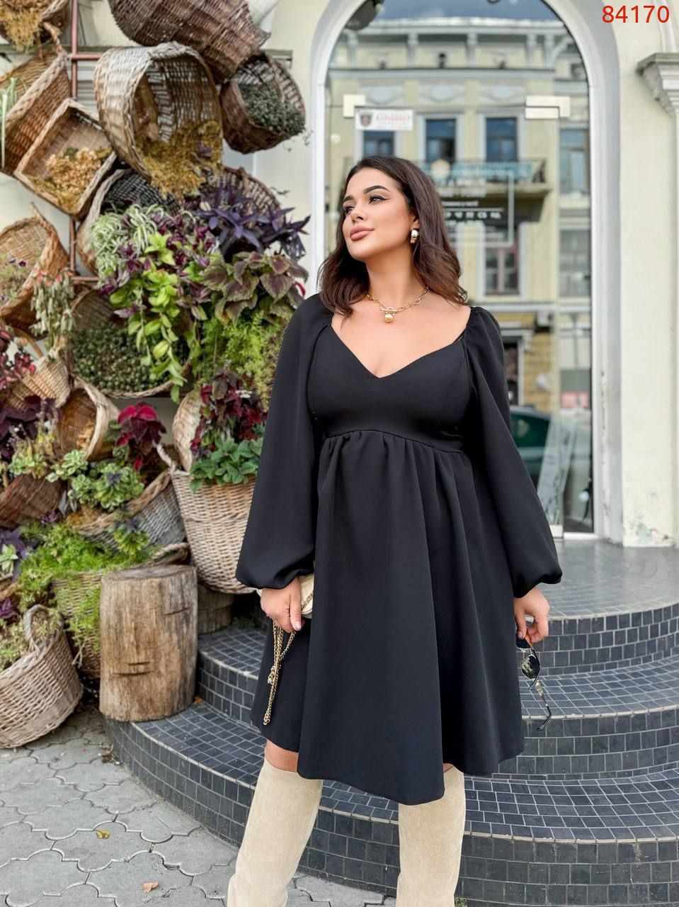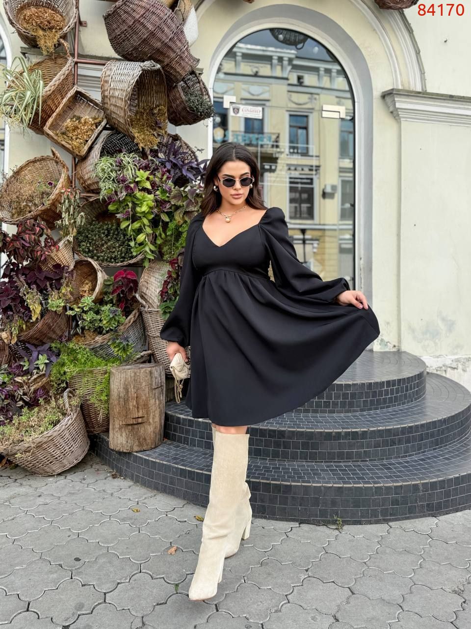 Сукня міді з облягаючим ліфом і розширеною спідницею. V-подібне декольте додає витонченості, підкреслюючи ключиці та шию.