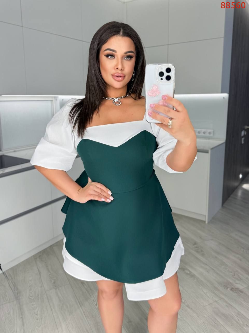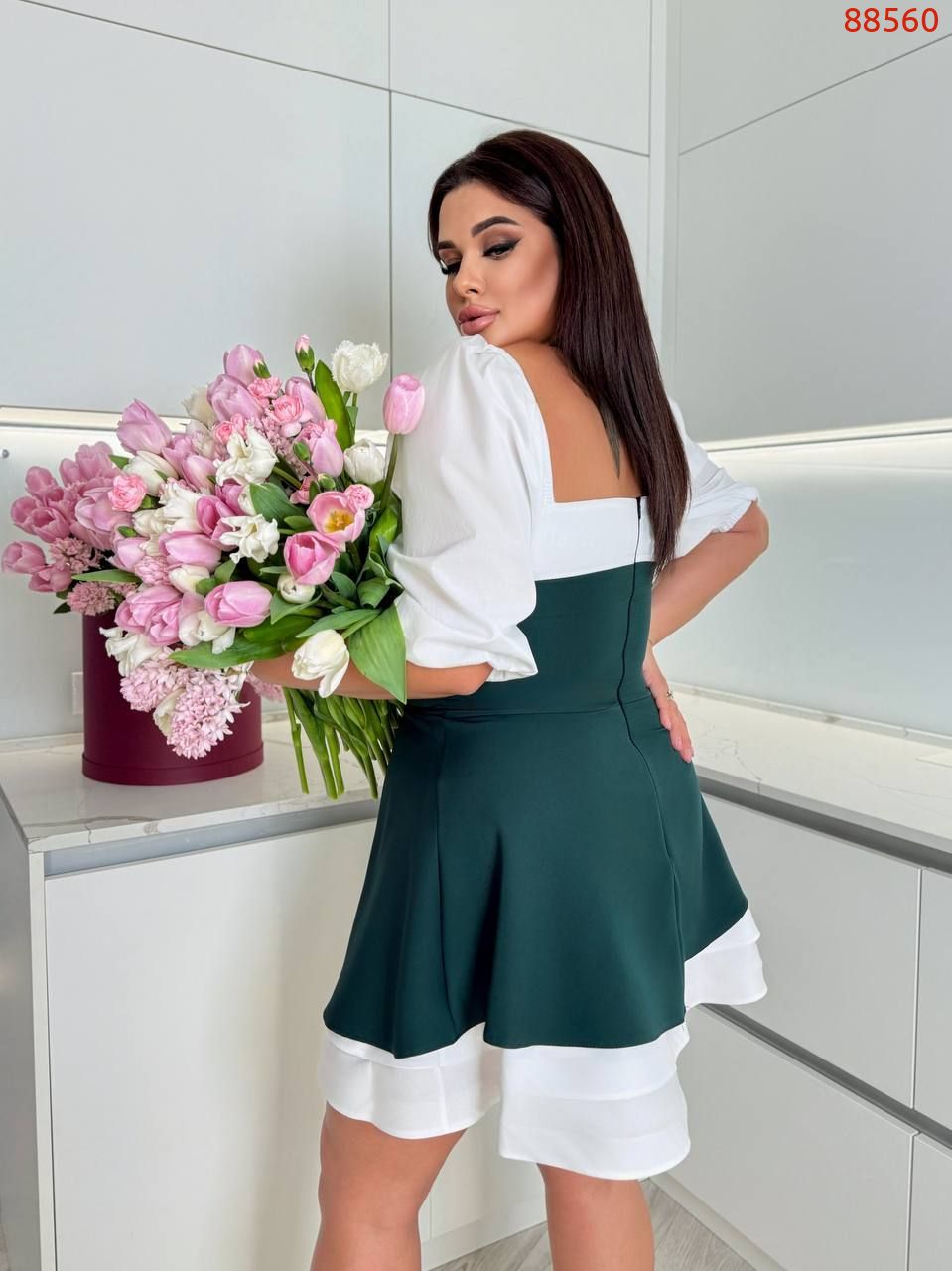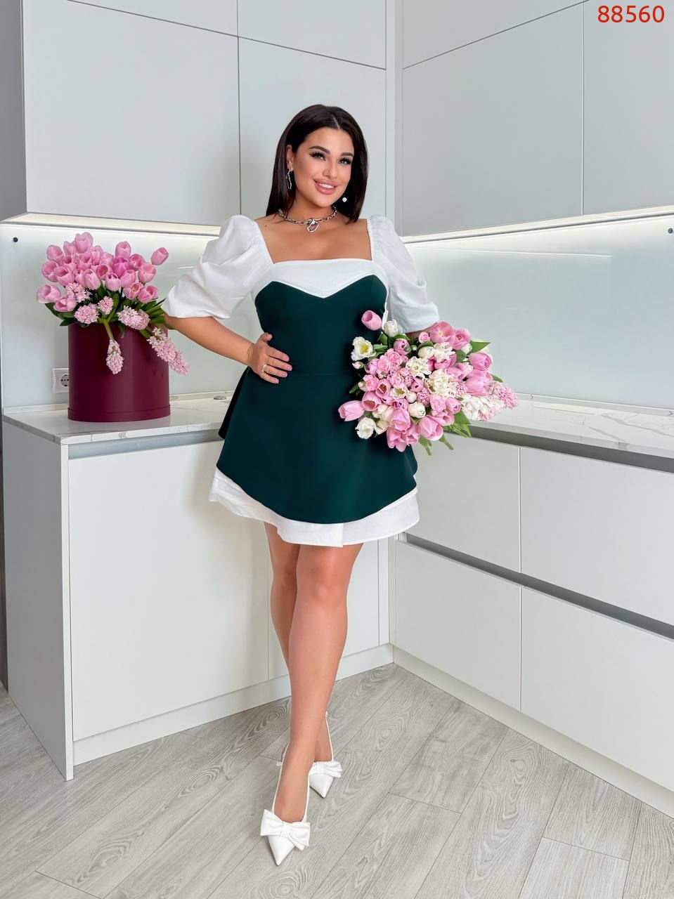Ця сукня складається з двох основних кольорів: чорного та білого. Верх сукні має оригінальний дизайн із комбінацією чорного корсета та білих рукавів. Чорний корсет надає елегантності та підкреслює талію, тоді як білі короткі обʼємні рукави створюють романтичний і ніжний вигляд. Пишний білий підклад оброблений кріноліном.