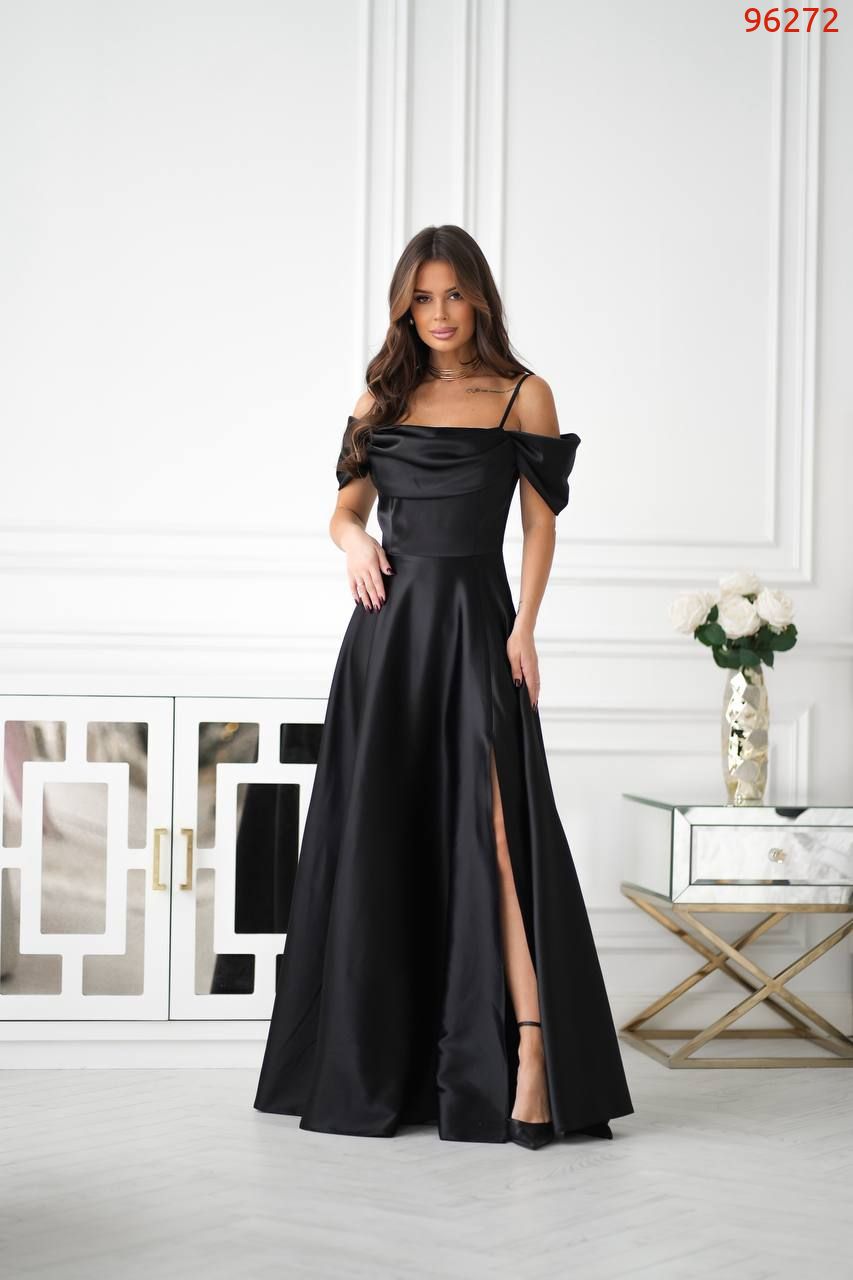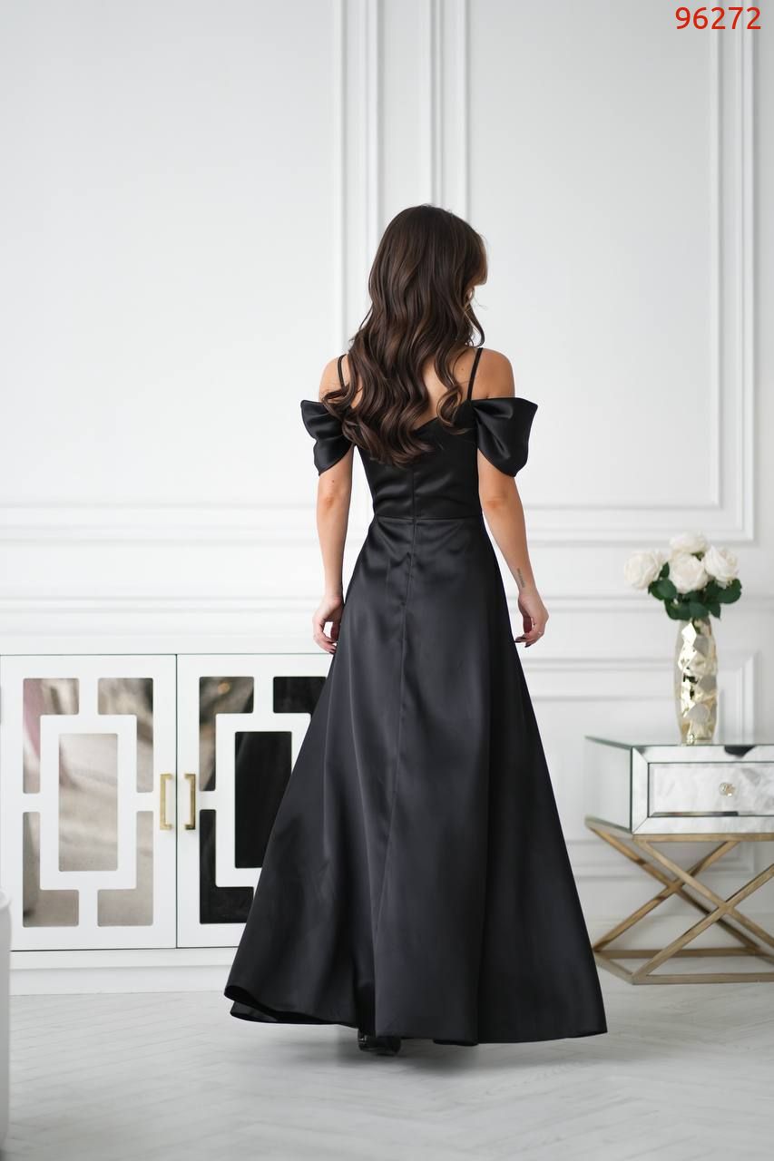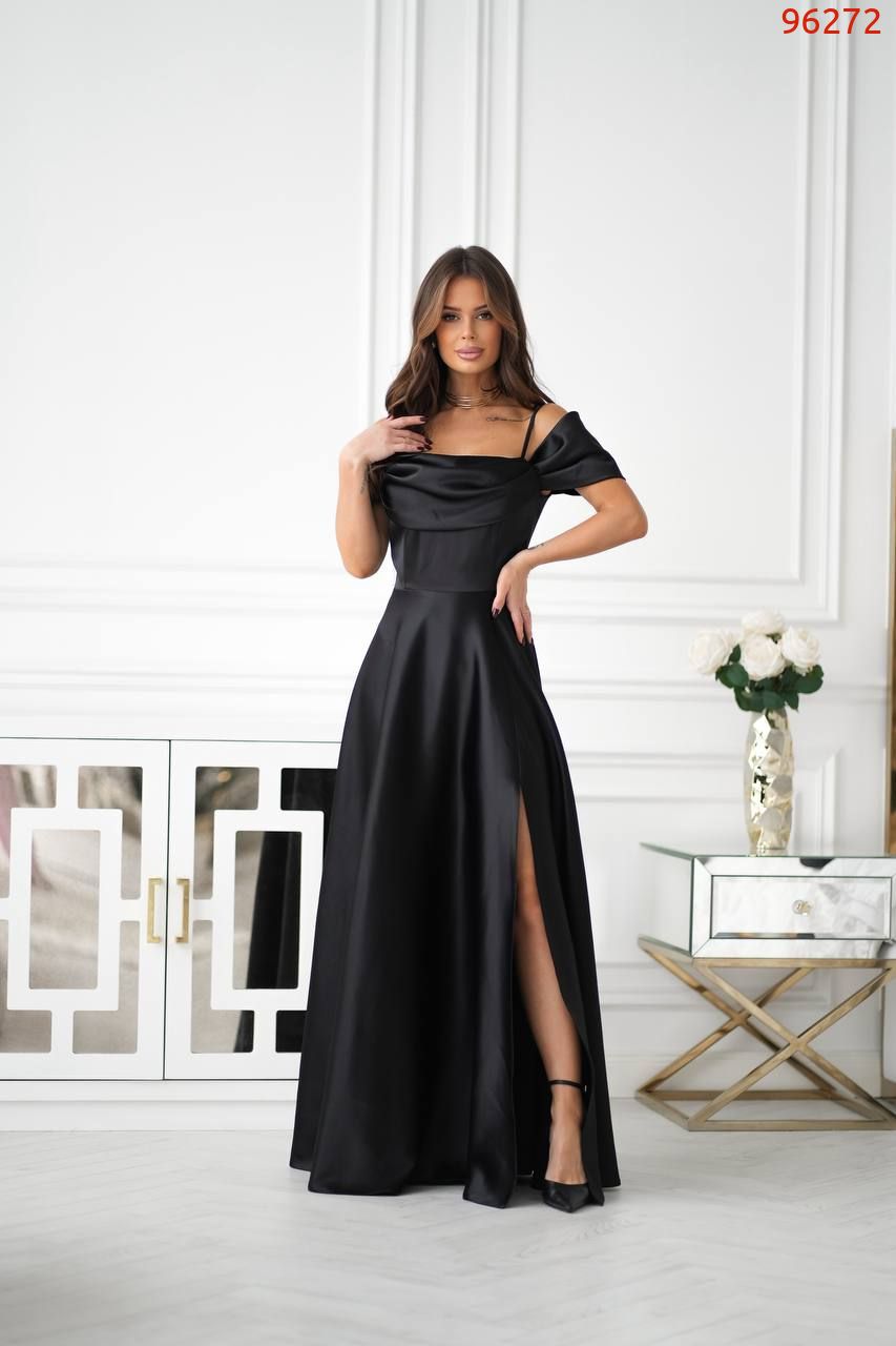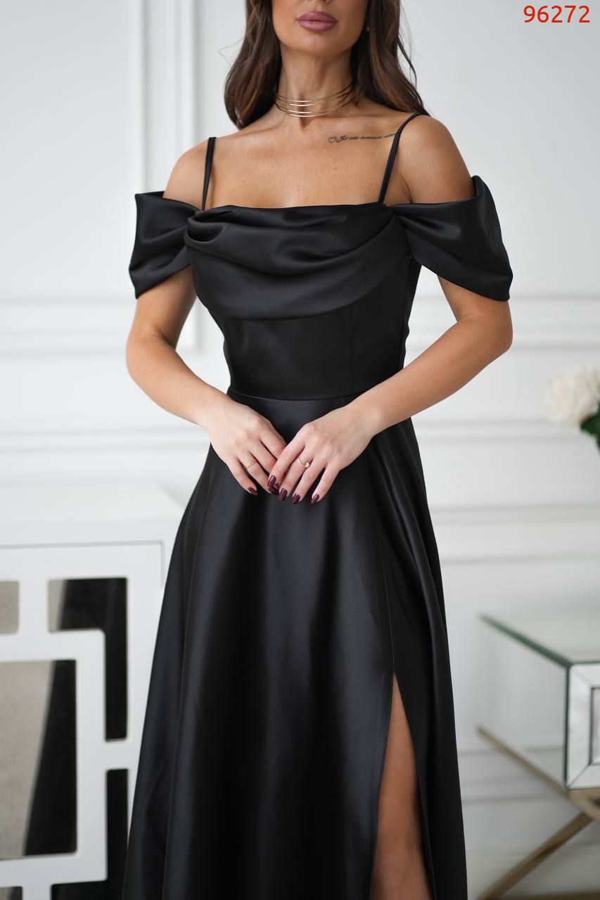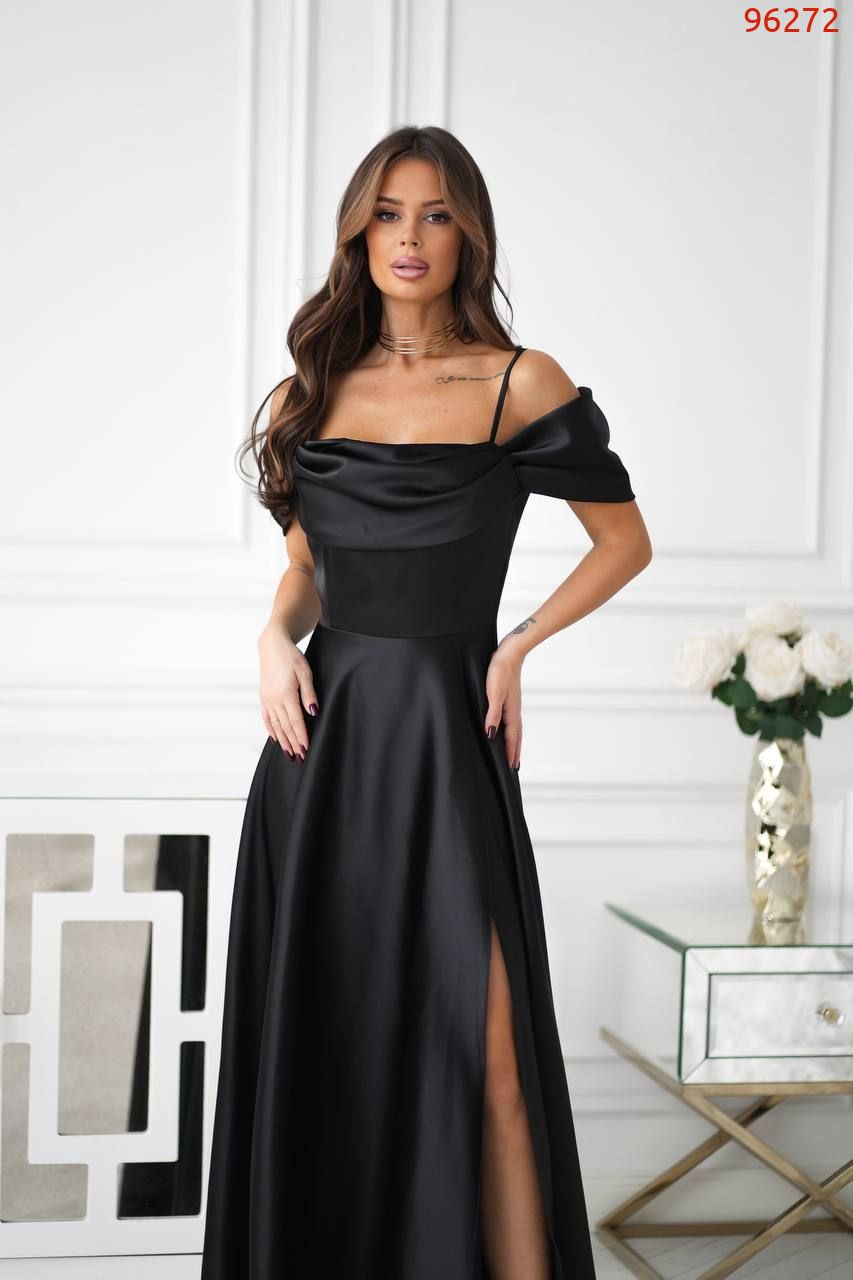Атласна сукня зі спущеними рукавамина брителях, озлобленна драпіруванням у зоні декольте, що надає образу витонченості та жіночності. Сукня ідеально підходить для особливих випадків, таких як весілля, вечірки або фотосесії.