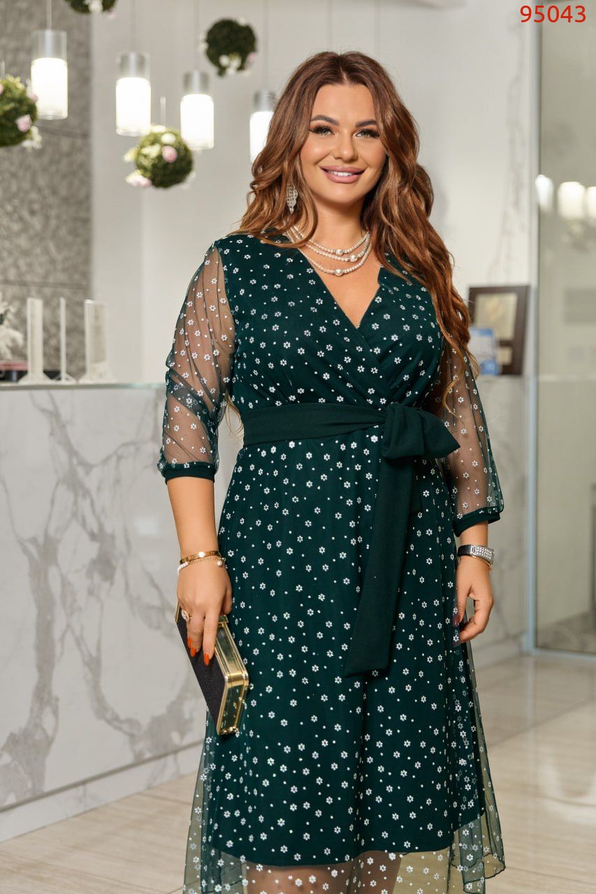 Елегантне жіноче плаття, виконане з кріп дайвінгу (тягнеться) і сітки з блиском. Перед сукні з імітацією запаху. До сукні додається знімний пояс із основної тканини. У такій сукні будь-яка жінка зможе відчути себе справжньої леді та королевою вечора, ця сукня здатна надати жінці ніжності, легкості та елегантності.