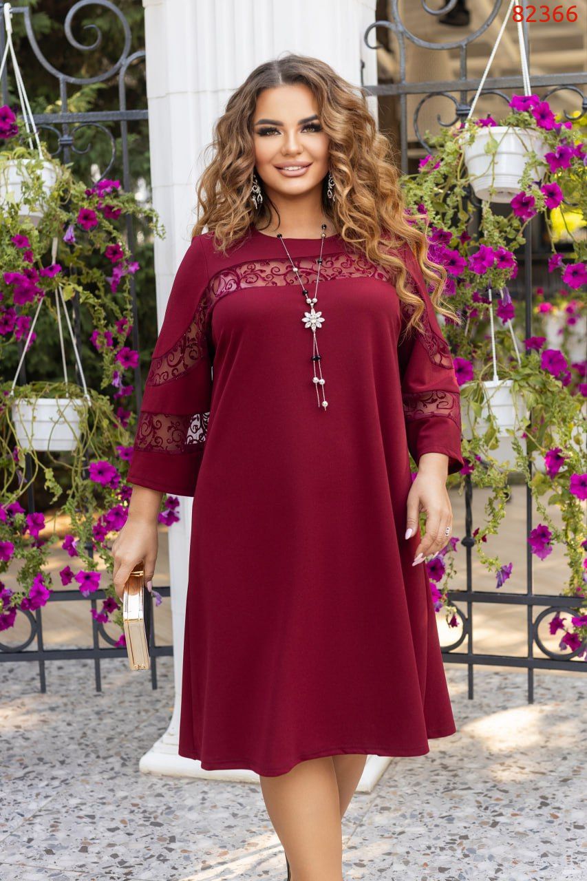 Ефектна жіноча сукня А-силуету. Це святкове, але в той же час елегантне вбрання прикрашене вставками з сітки з блискучим напиленням і здатне підкреслити індивідуальність і шляхетність своєї володарки. На спинці оброблена крапелька на навісну петлю та гудзик. Силует сукні чудово приховує нюанси фігури та підкреслює переваги.