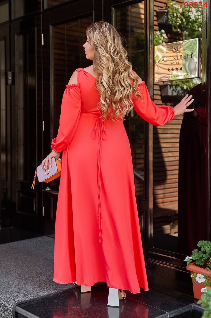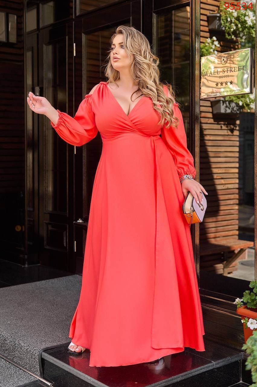 Довжина 143см, одягається на запах, перетинками по ліфу можна регулювати декольте. Робити більш-менш відкритим. Якщо перетинки будуть на плечах - декольте буде більш закрито. Якщо опустити їх нижче- декольте відкриється. Ідеальна посадка. Спідниця-напівсонце – не повнить. Легке, приємне до тіла.