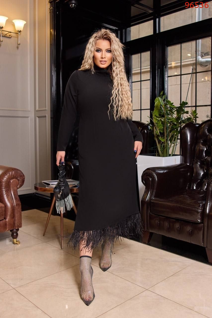 Тканина: костюмнй креп. Оздоблення - пір'я марабу, довжина 120 см, збоку розріз, застібка - блискавка. Ззаду шнурується- цим регулюється приталеність.