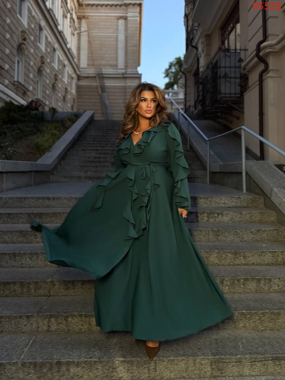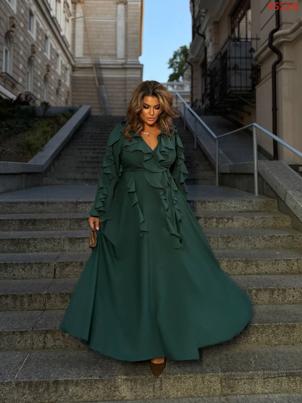 Довжина 143см, одягається на запах. Ідеальна посадка. Спідниця-напівсонце – не повнить. Легке, приємне до тіла. Прикрашення- паси - Тренд цього сезону. Вони роблять сукню повітряною , додають шарму