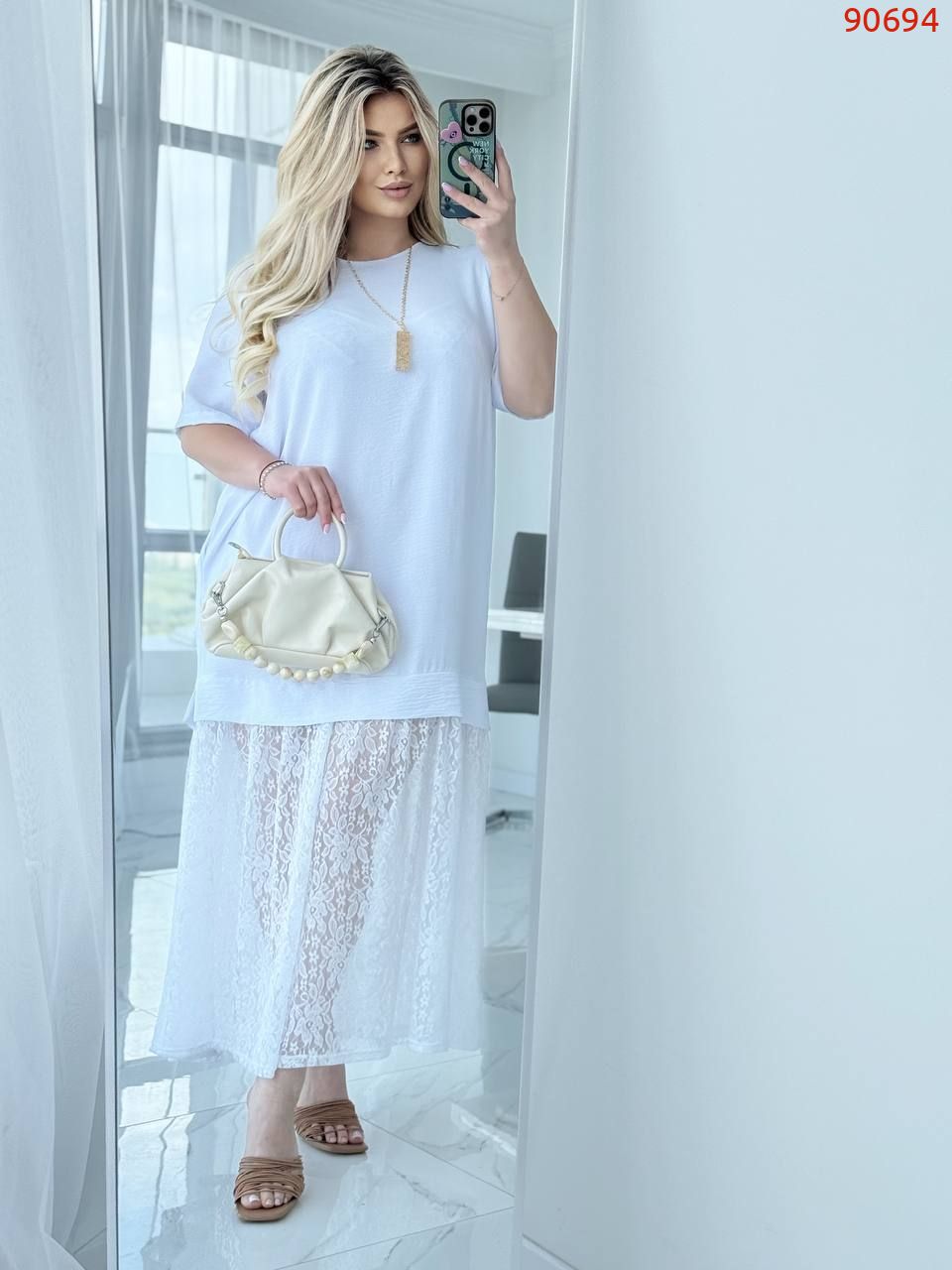 Сукня відрізняється оригінальним поєднанням стилів та фактур. Верхня частина виконана у вигляді вільної футболки з коротким рукавом, наголошуючи на комфортності виробу, в бічних швах - кишені. Спідниця виконана з елегантного гіпюру, що створює легку легкість та жіночність силуету. Сукня має довжину в підлогу, візуально подовжує фігуру і надає образу романтичності та витонченості.