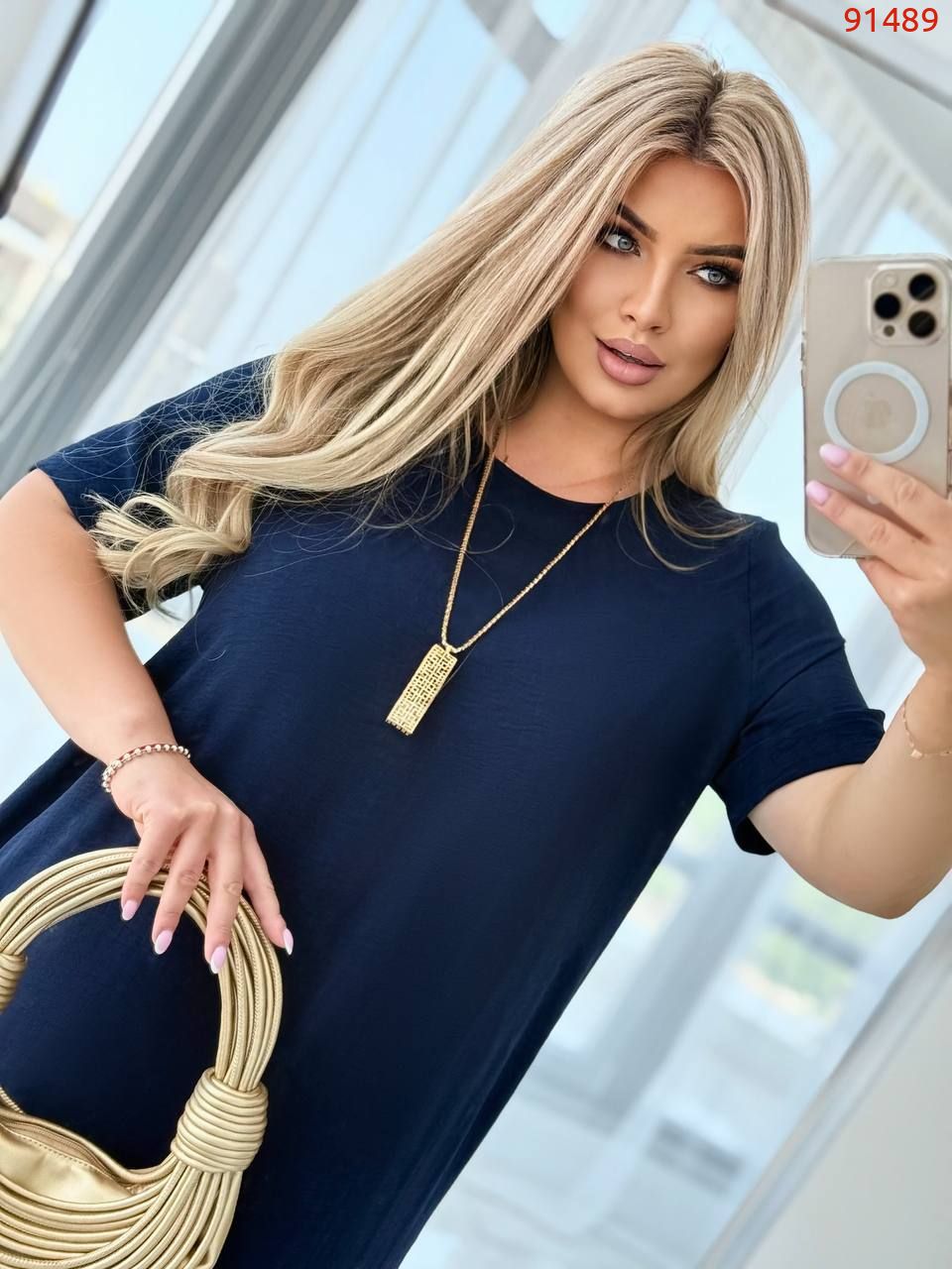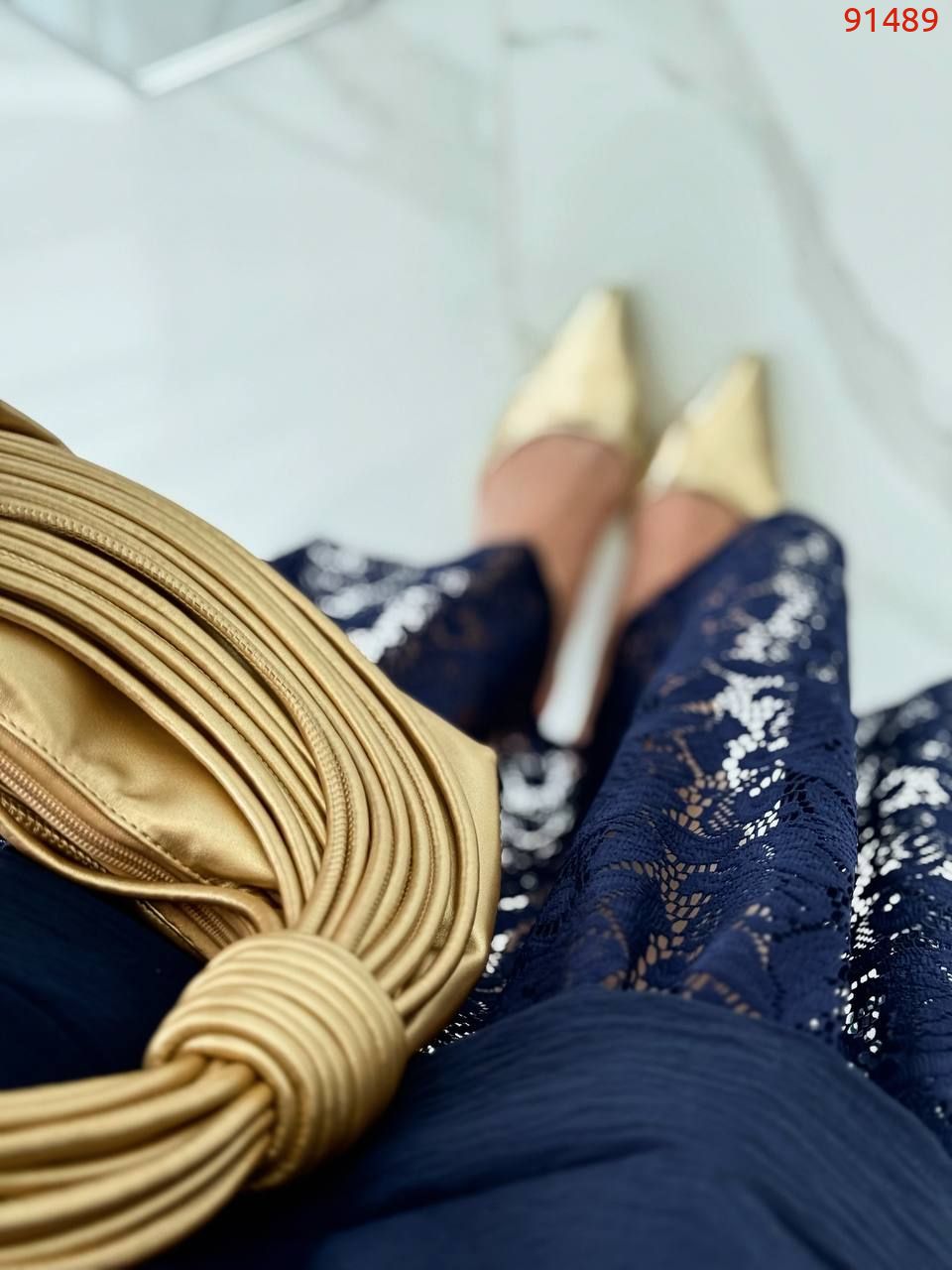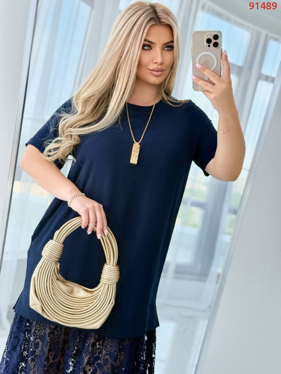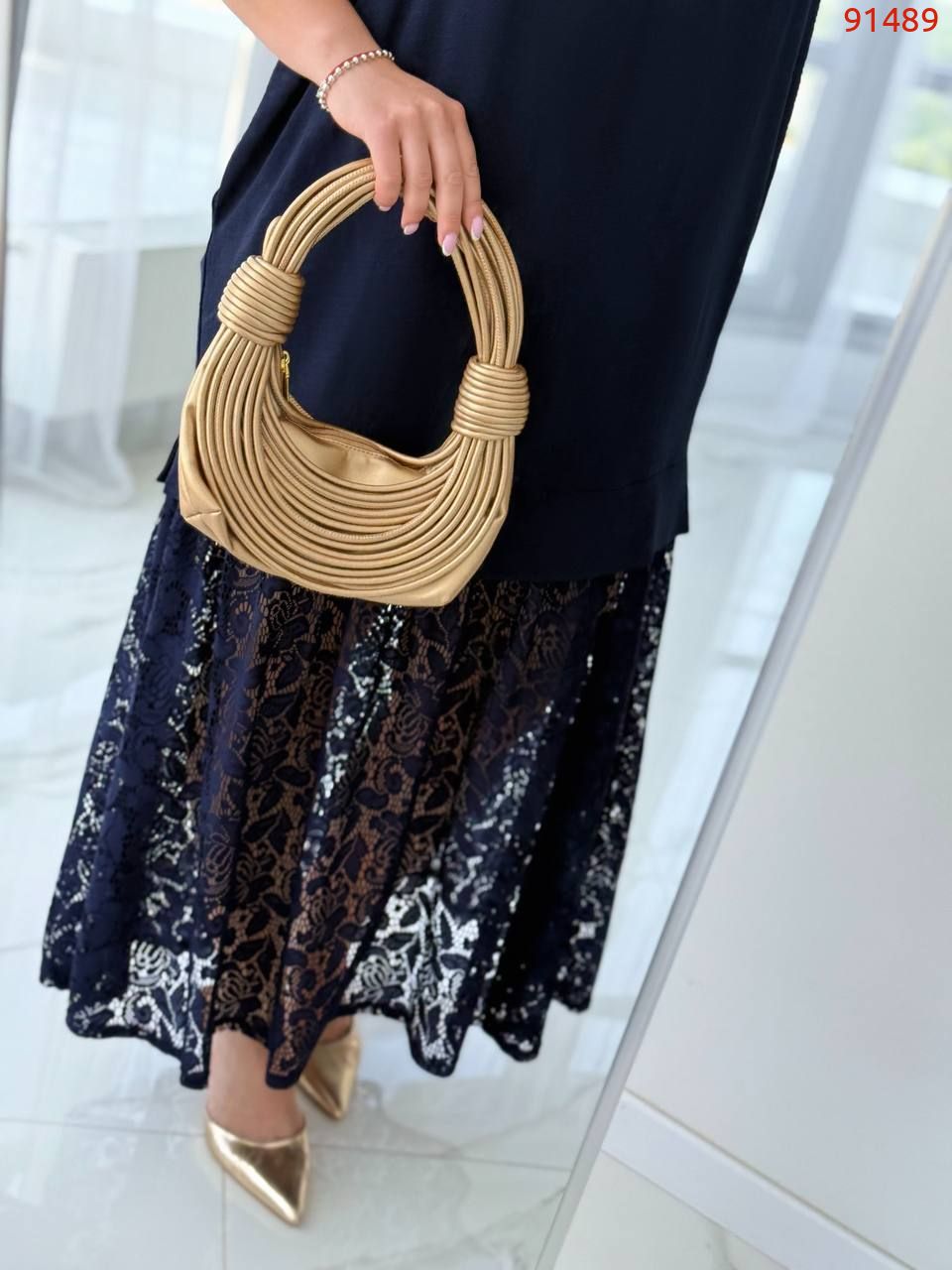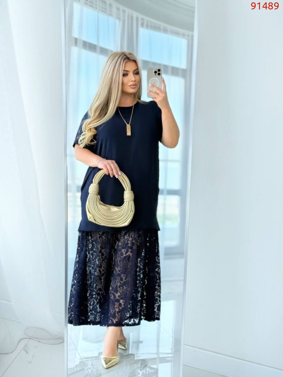Сукня відрізняється оригінальним поєднанням стилів та фактур. Верхня частина виконана у вигляді вільної футболки з коротким рукавом, наголошуючи на комфортності виробу, в бічних швах - кишені. Спідниця виконана з елегантного гіпюру, що створює легку легкість та жіночність силуету. Сукня має довжину в підлогу, візуально подовжує фігуру і надає образу романтичності та витонченості.