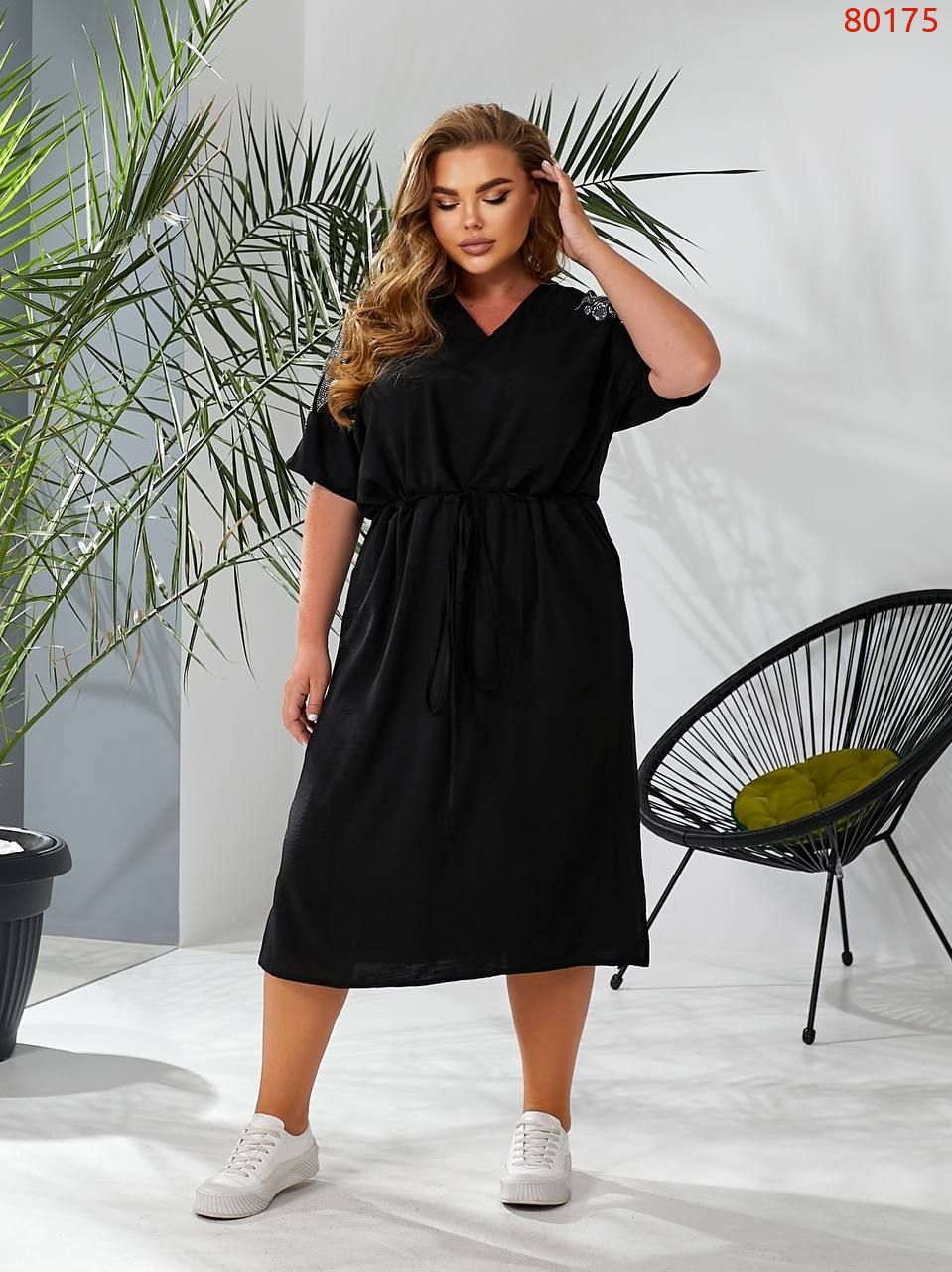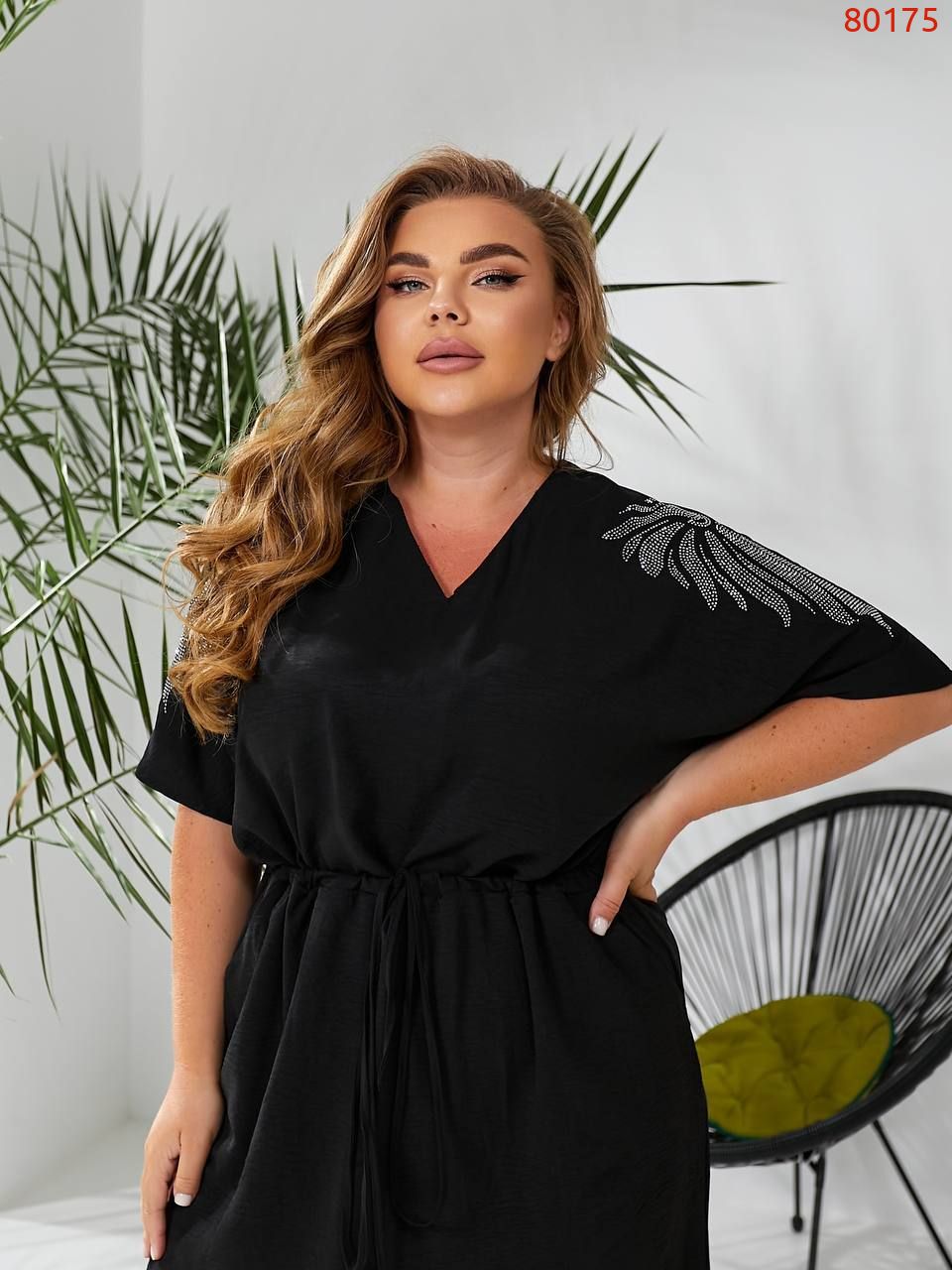 Сукня затягується на куліску на талії, з боків розрізи, кишені, плечі декоровані камінням