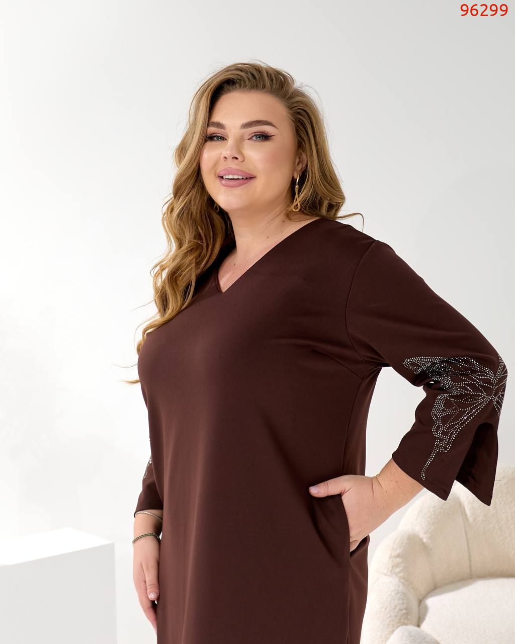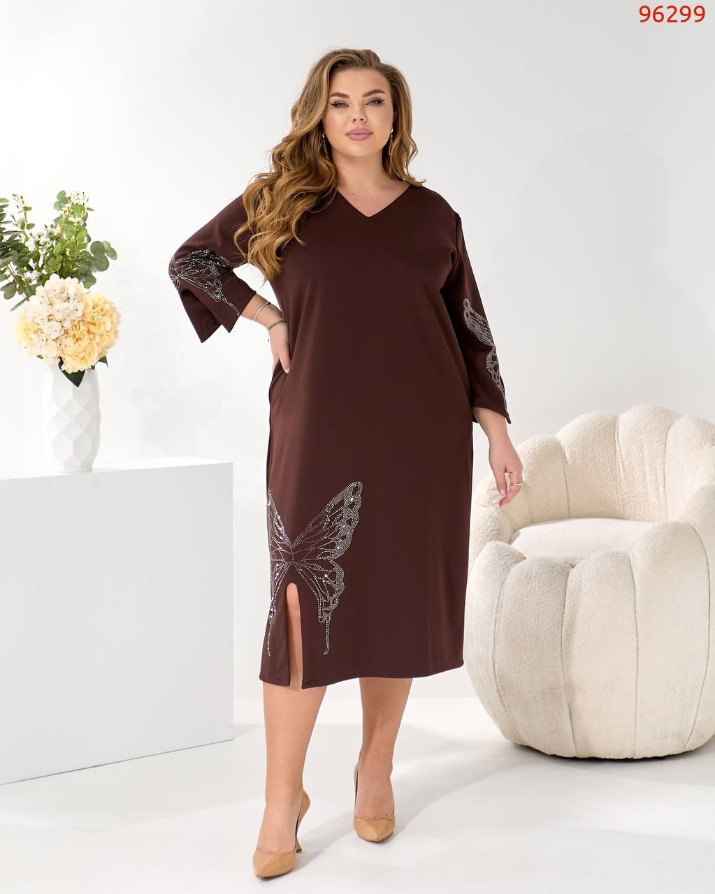 Представляємо елегантну сукню міді, виконану у вільному, прямому крої з V-подібним вирізом, що гарантує ідеальну посадку на будь-яку фігуру.