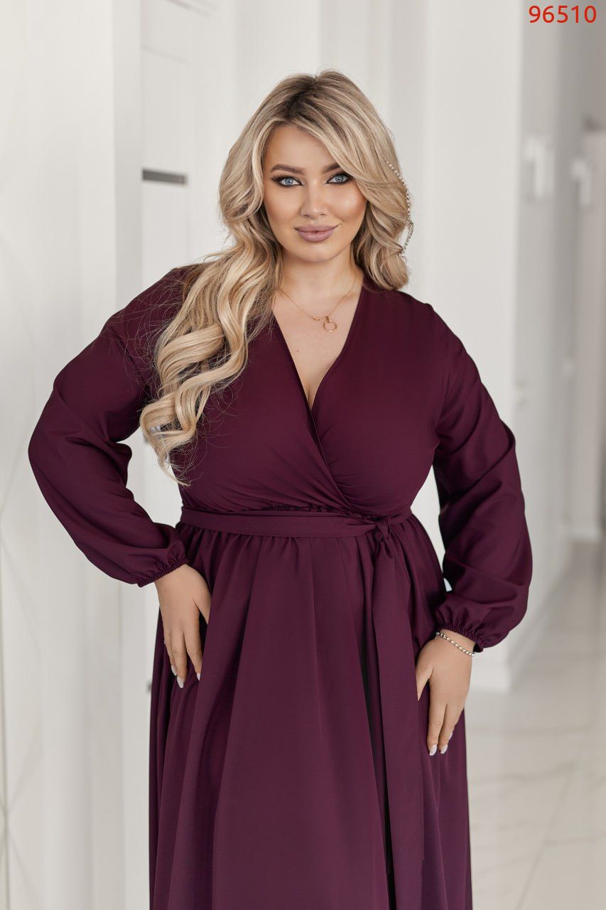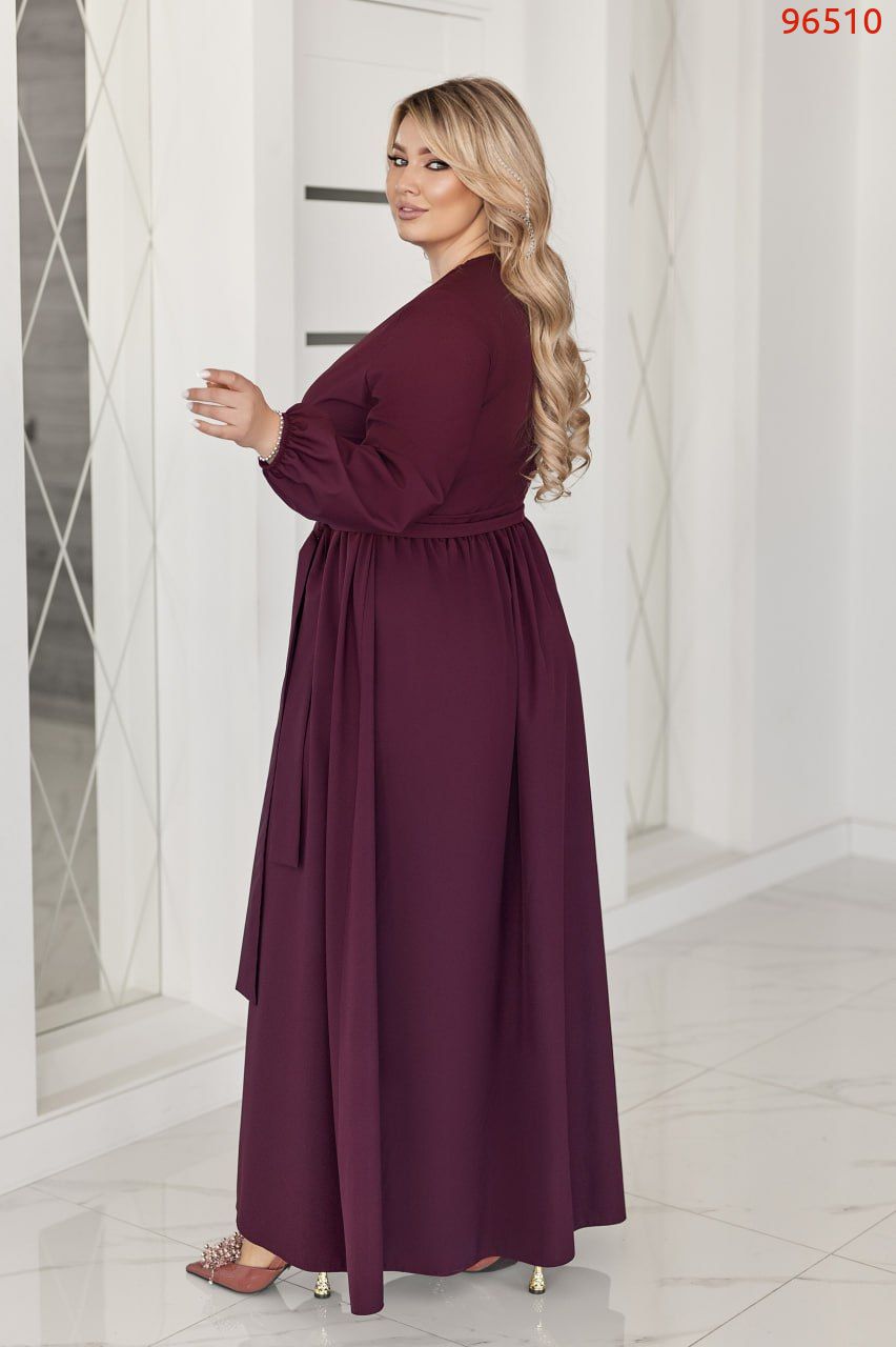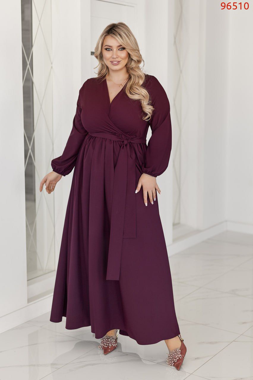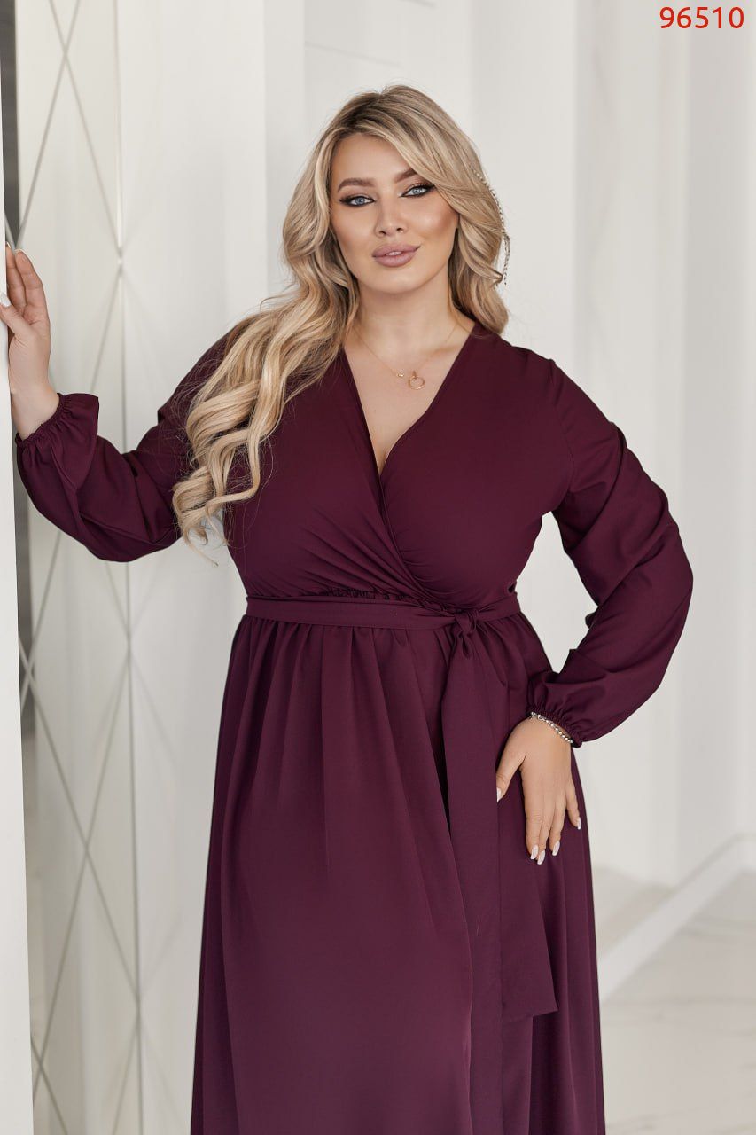 Неймовірно жіночна довга сукня у вечірньому стилі із софта (легка тканина. розтяжності немає). Ліф сукні виконано на запАх. Рукави довгі, на резинці по низу. Талія відрізна, зібрана на резинку. Спідниця форми сонцекльош. Пояс із основної тканини в комплекті. Застібок, кишень немає.