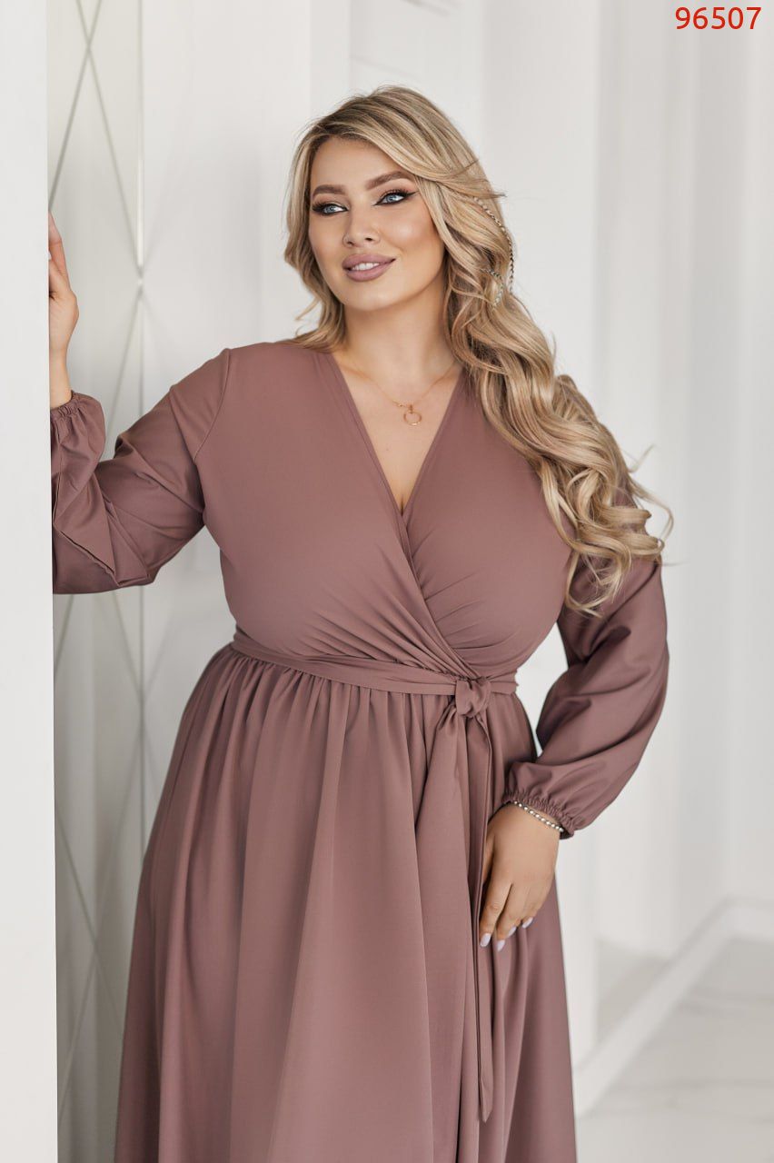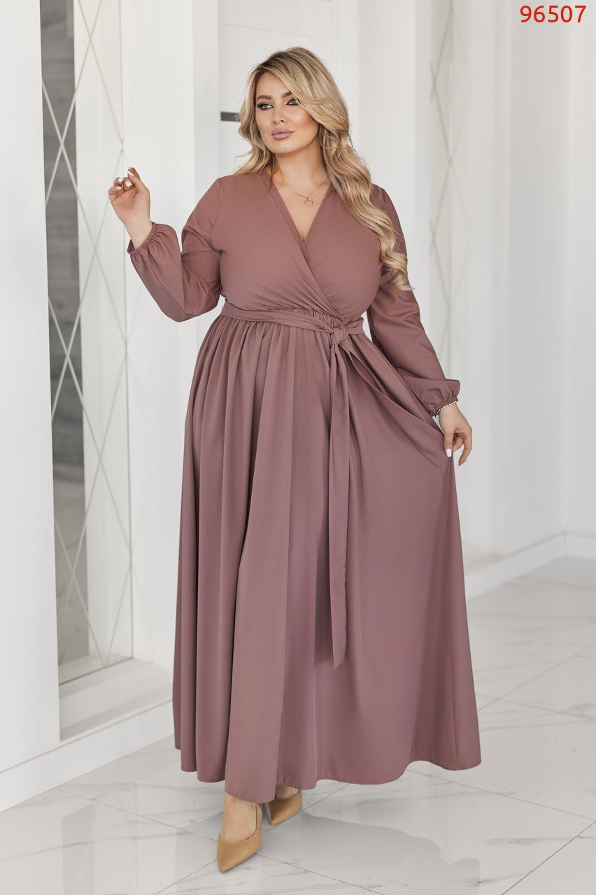 Неймовірно жіночна довга сукня у вечірньому стилі із софта (легка тканина. розтяжності немає). Ліф сукні виконано на запАх. Рукави довгі, на резинці по низу. Талія відрізна, зібрана на резинку. Спідниця форми сонцекльош. Пояс із основної тканини в комплекті. Застібок, кишень немає.