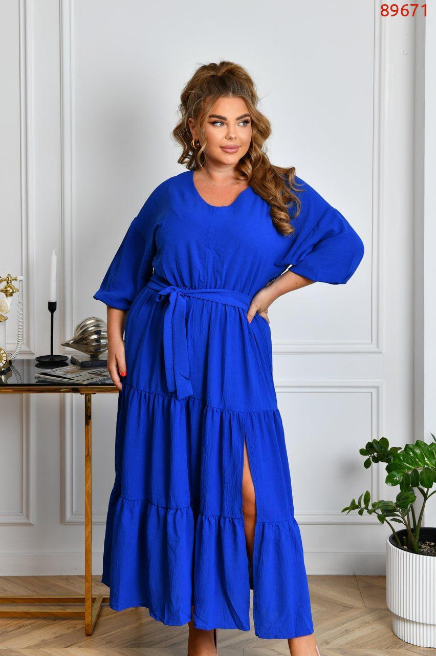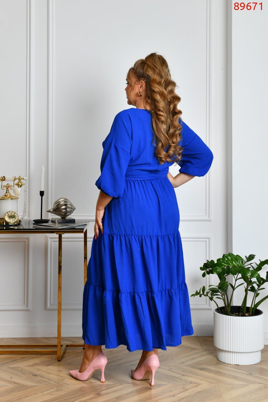 Сукня з широким рукавом, низ якого на резиночці, завдяки якій його можна вкорочувати, лінія плеча спущена, горловина має V-подібний виріз. Лінія талії відрізна, та призібрана на резинку. Низ сукні із трьох розкішних воланів. Попереду оброблений розріз. Пояс із основної тканини в комплекті. Кишень та застібок немає.