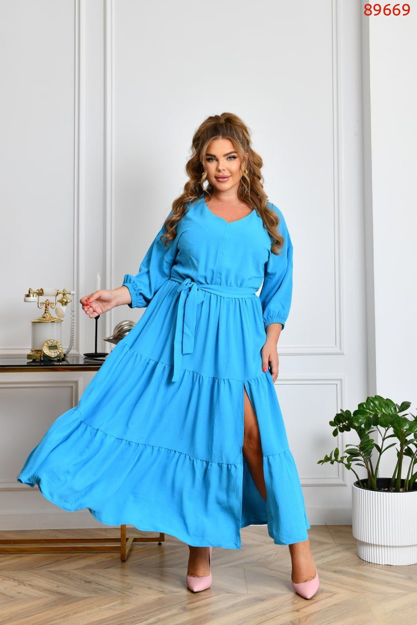 Сукня з широким рукавом, низ якого на резиночці, завдяки якій його можна вкорочувати, лінія плеча спущена, горловина має V-подібний виріз. Лінія талії відрізна, та призібрана на резинку. Низ сукні із трьох розкішних воланів. Попереду оброблений розріз. Пояс із основної тканини в комплекті. Кишень та застібок немає.