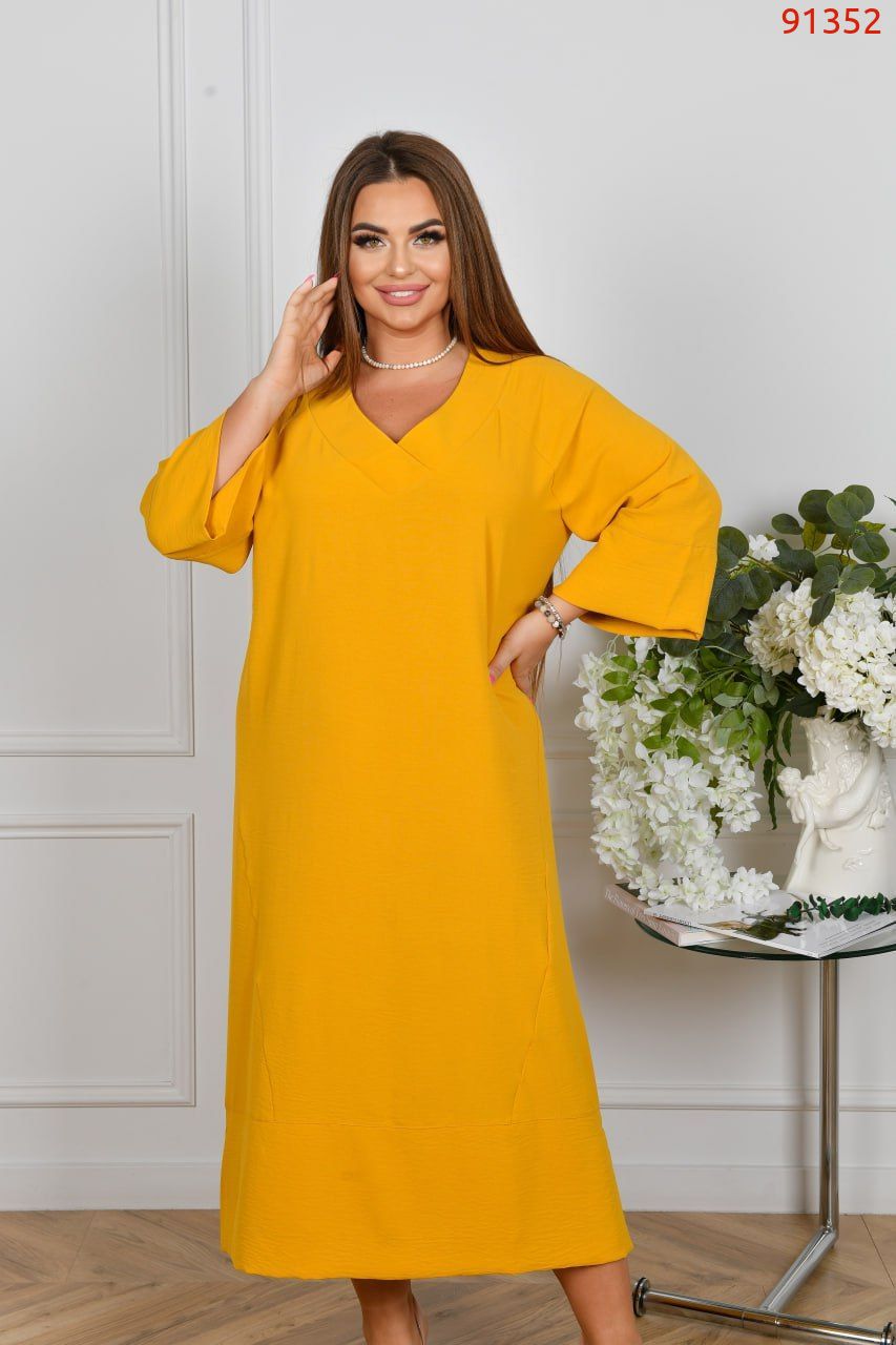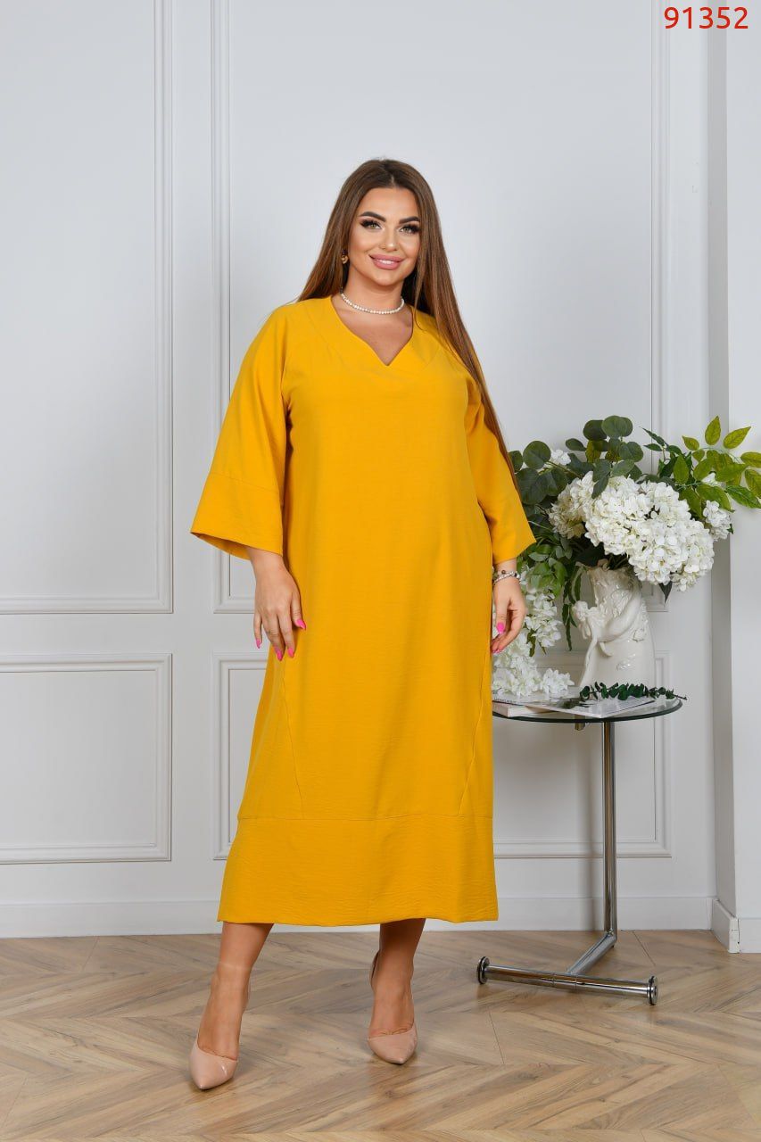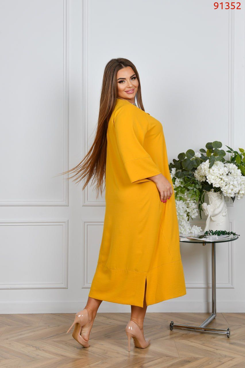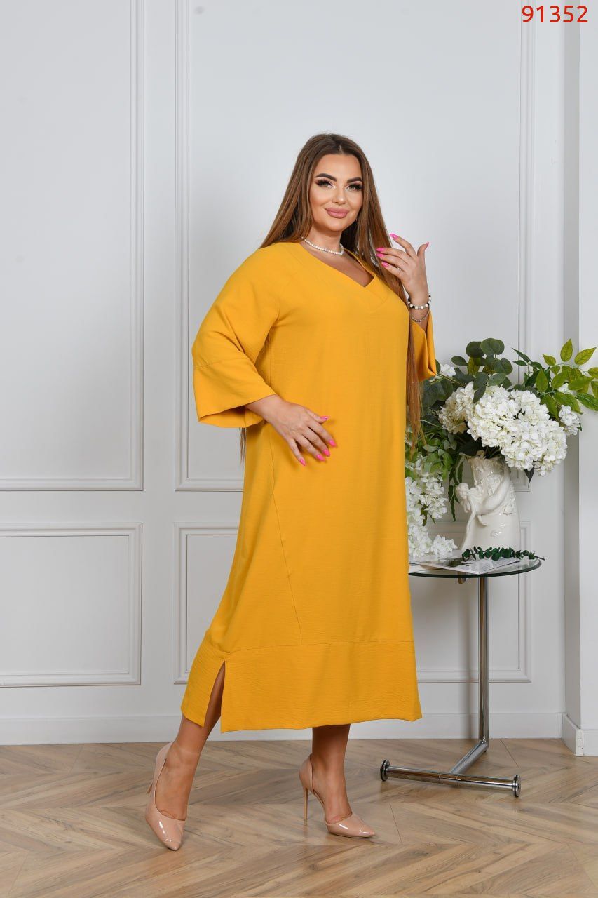 Силует плаття вільний, прямий (на фігурі повинно бути вільним, така модель). Виріз горловини V-подібний, що візуально робить шию стрункішою. Рукав - реглан, довжиною 3/4. Внизу, з боків є розрізи. Застібок, кишень немає.