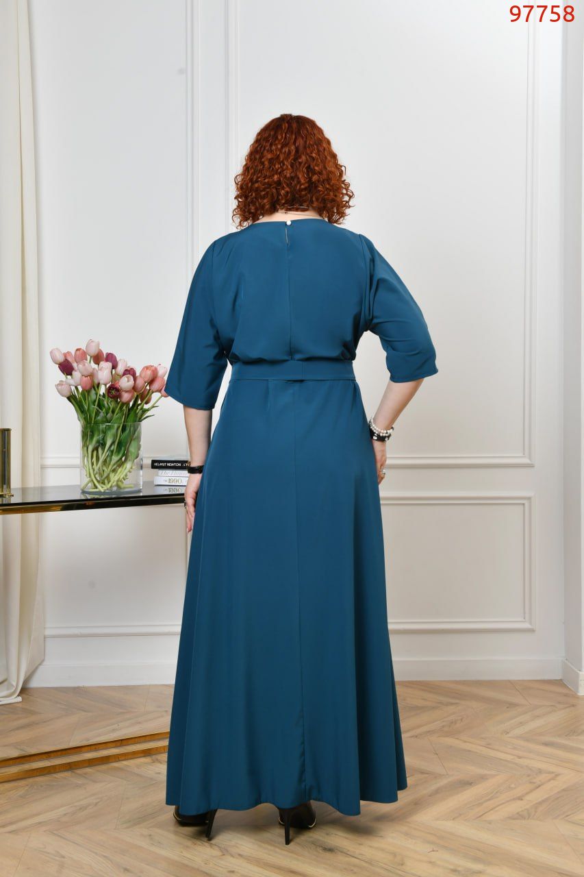 Сукня має відрізну лінію талії, верх силуету «летюча миша», рукав довжиною по лікоть. Виріз горловини круглий. Спідниця у формі трапеції. В бічних швах оброблені кишені. Пояс із основної тканини в комплекті.