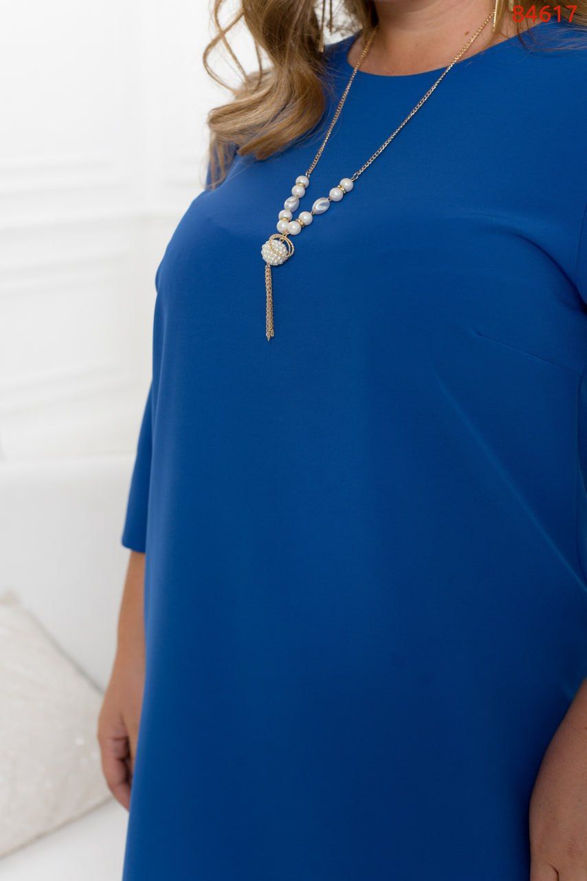Елегантна та мінімалістична сукня з напівкруглим широким вирізом горловини. Рукав вільний без манжета довжиною 3/4. Застібок немає. На грудях діагональні виточки. Прикраса входить в комплект
