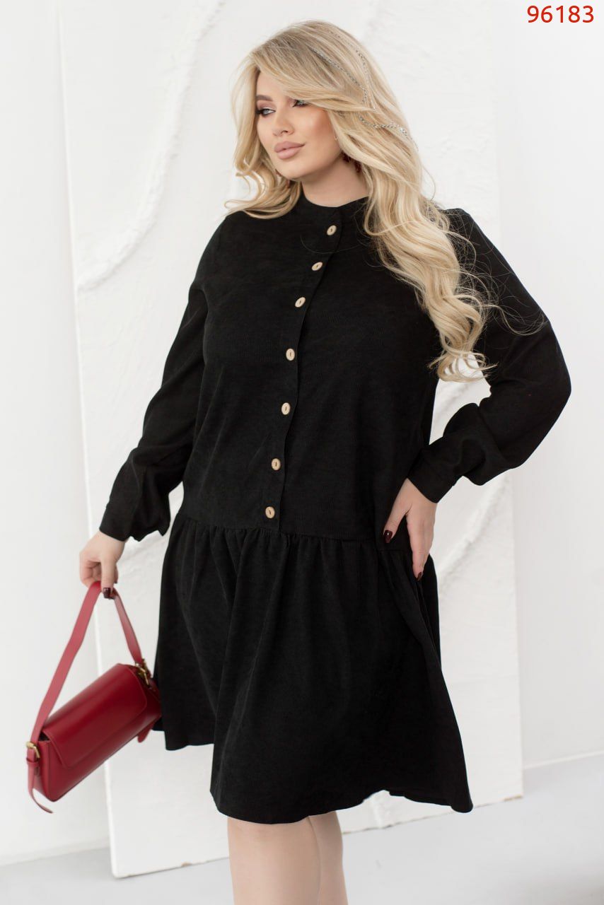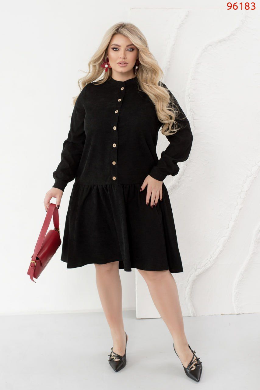 Це жіночна сукня, виконана з м'якої вельветової тканини, зробить ваш образ стильним, модним і вишуканим. Модель доповнена коміром-стійкою, довгими рукавами з манжетами і повітряним грайливим воланчиком, підшитим до подолу, а також кишеннями. Сукня застібається на ряд гудзиків спереду по центру.