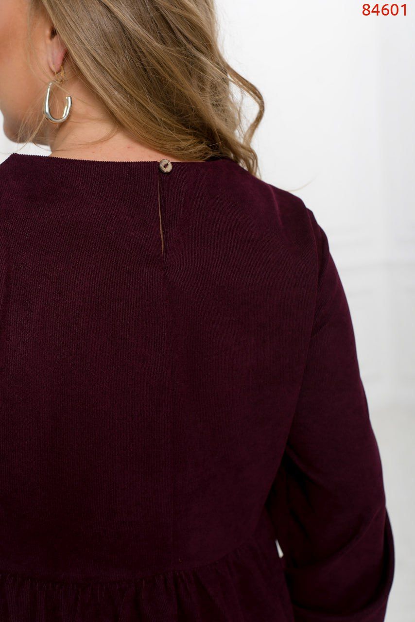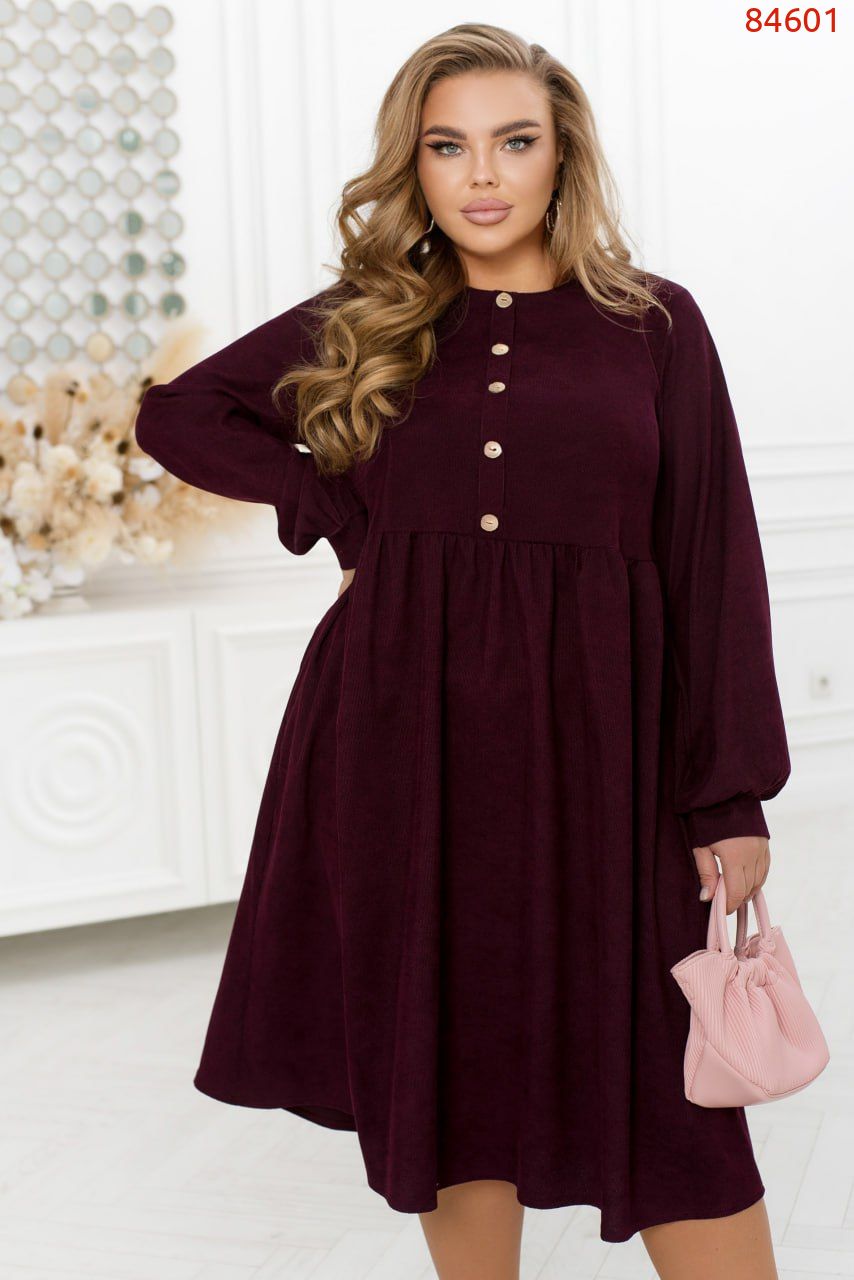 Яскрава жіночна сукня міді, виконана з текстурної вельветової тканини, внесе в образ трішки кокетства, романтизму і жіночності. Модель із завищеною талією доповнена декоративними гудзиками на планці і довгими рукавами з манжетами.