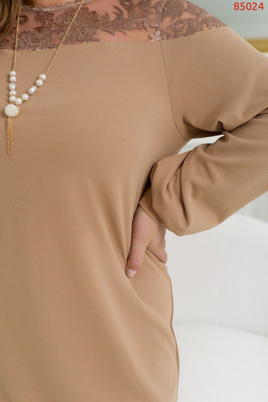 Витончена жіночна сукня з вставкою і тонкого мережива на плечах – універсальне рішення для будь-якої модниці. У ньому цілком можна з'явитися як в офісі, так і на корпоративі або святі. Модель без застібок і кишень доповнена довгими рукавами з манжетами і нагрудними виточками, що забезпечують ідеальну посадку на грудях.