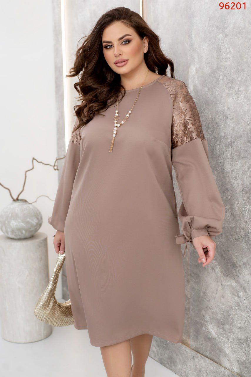 Витончена жіночна сукня стане універсальним рішенням як для зустрічі з друзями, так і для вечірки, роблячи ваш образ стильним, модним і вишуканим. Родзинкою цієї моделі є вставки з ніжного мережива на плечах і довгі рукава з манжетами на зав'язках.