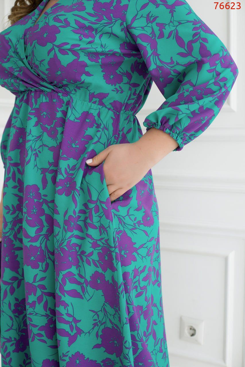 Ця сукня стане вашим незамінним другом, будь то вечірні заходи, романтичні прогулянки чи офісний день. Має бездоганну посадку завдяки гумці на талії, яка чудово підкреслить вашу фігуру. Ліф сукні підшитий на запах, що надає йому чарівний акцент і вишуканість. Рукави 3/4, доповнені гумкою, надають елегантності сукні та роблять її актуальною у будь-яку пору року. Не менш важливою деталлю є врізні кишені з боків, які не тільки підкреслюють дизайн, але й надають практичності вашому образу. Ви зможете легко зберегти свої необхідні речі під рукою, не втрачаючи стиль та грацію.