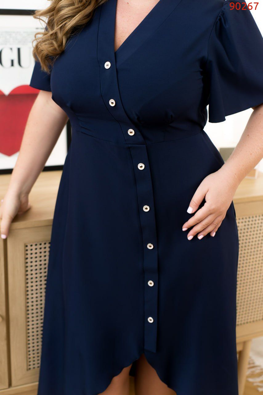 Ця однотонна сукня стане універсальною й улюбленою річчю в гардеробі. Діагональні гудзики, які проходять від горловини через відрізну лінію талії та до коліна- це головна особливість сукні, що створює акцентну лінію. Рукава-крильця надають повітряності образу. Поділ по передній частині сукні вкорочений. Цей виріб привертає увагу своїми цікавими деталями та при цьому має лаконічний дизайн, який підкреслить вашу неповторну красу.