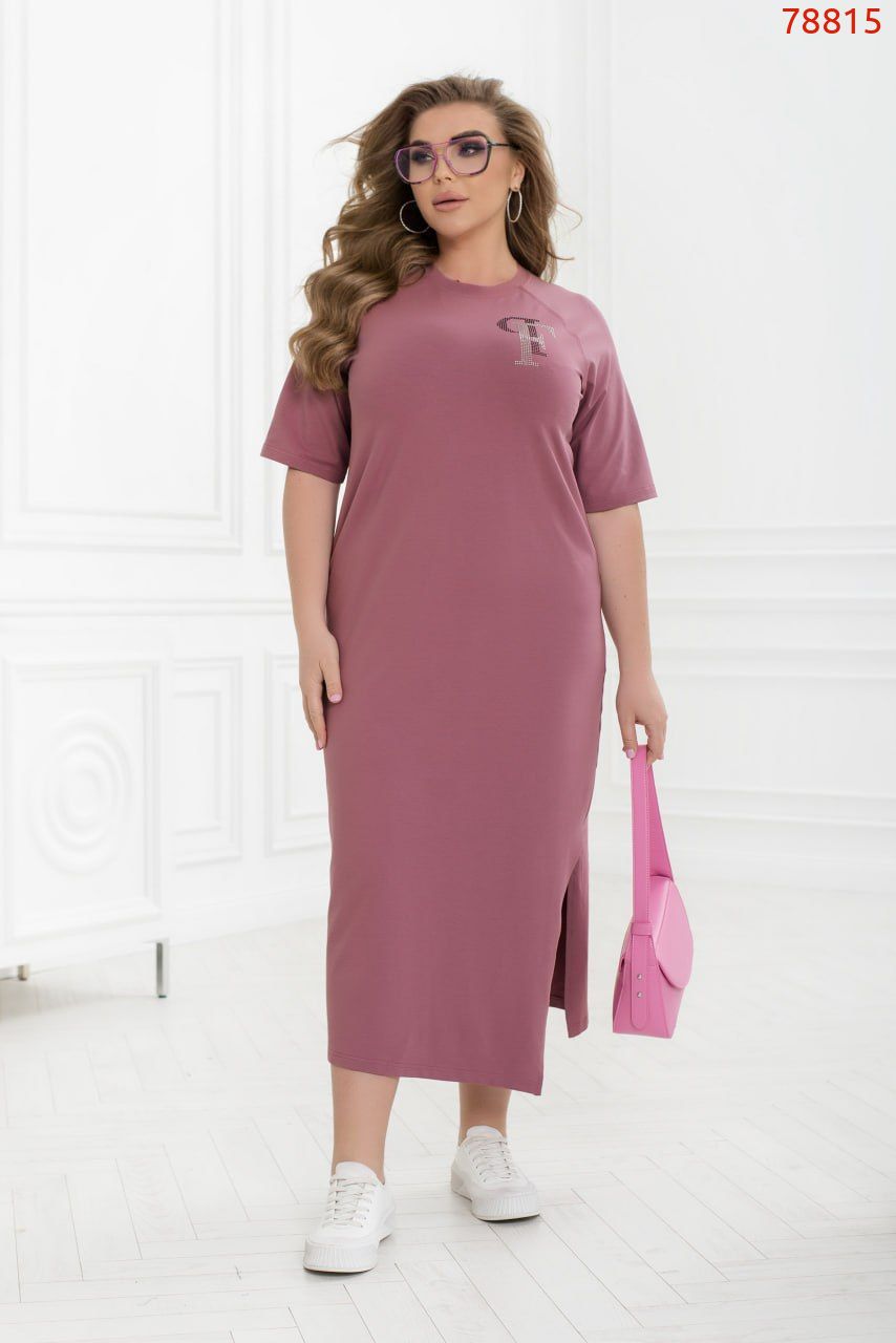 Базова сукня-футболка - це маст-хев для всіх жінок у спекотну погоду. Модель прямого крою з круглим коміром і відрізними короткими рукавами з манжетами. На подолі з одного боку є оброблений розріз, який додає грайливості образу. Модель прикрашена написом зі стразів. Вільний крій і базові кольори сукні створюють мінімалістичний комфортний образ.