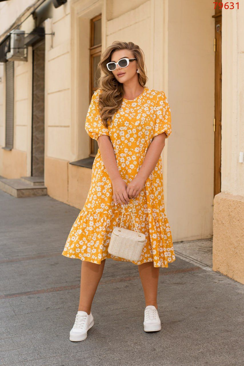 Ця чарівна сукня, створена з легкого штапеля, зачаровує з першого погляду. Її ніжна тканина торкається вашої шкіри з неперевершеною легкістю і забезпечує повний комфорт навіть у найспекотніші дні. Модель сукні має короткі рукави з гумкою, що надає еластичності та створює невеликий об'єм на плечах. Це створює легкість і свободу рухів, забезпечуючи комфорт протягом дня. На сукні розташований грайливий воланчик, підшитий по краю подолу. Цей воланчик надає сукні жіночності та романтичності, створюючи додатковий акцент. Завдяки своєму легкому матеріалу і простоті крою, ця сукня легко комбінується з різними аксесуарами і взуттям. Ви можете створити ніжний літній образ, додавши до неї босоніжки і стрічку у волосся, або створити більш спортивний стиль, поєднавши її з кедами і сумкою на плечі. Зверніть увагу, що тканина може давати усадку під час прання.
