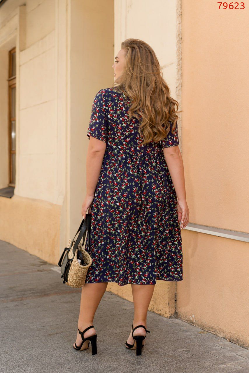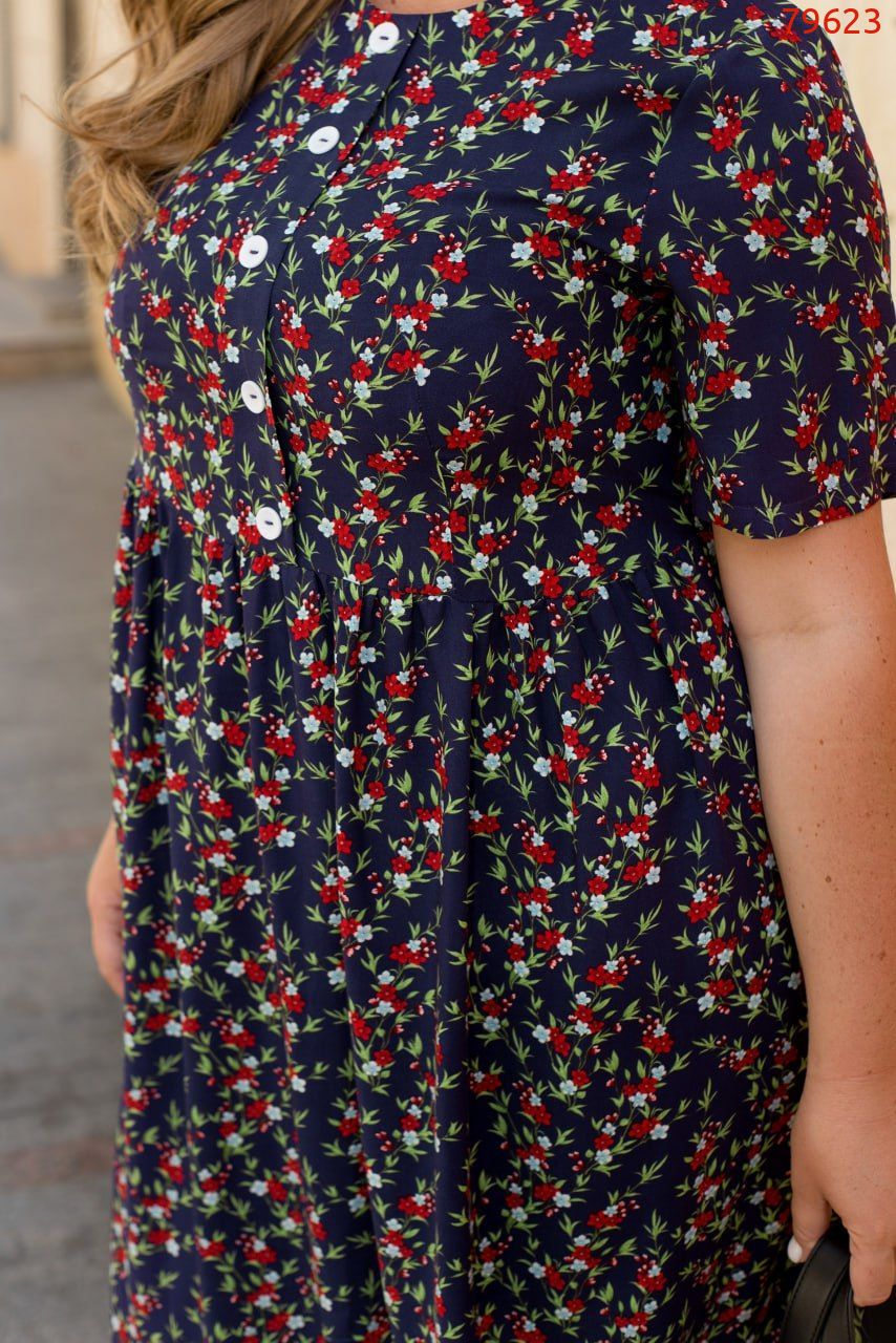 Уявіть собі сонячний ранок, коли ви крокуєте по квітучому саду в своїй новій яскравій сукні з легкого штапелю. Ця сукня створена, щоб дарувати вам відчуття легкості та безтурботності в кожному русі. Короткі рукава ніжно обіймають ваші руки, забезпечуючи комфорт навіть у найспекотніші дні. Напівкруглий виріз горловини витончено підкреслює лінію вашої шиї, додаючи елегантності та жіночності вашому образу. Декоративні ґудзики, розташовані на передній частині сукні, наче маленькі перлини, привертають увагу та додають особливого шарму. Відрізна талія делікатно підкреслює вашу фігуру, а вільна юбка граційно коливається в такт вашим крокам, створюючи чарівну гру тіней та світла. Застібка на один ґудзик ззаду додає ще один ніжний акцент, завершуючи цей витончений образ. Сукня має зручні бічні кишеньки. Насолоджуйтеся кожним моментом літа у цій сукні, яка дарує вам свободу та впевненість. Одягнувши її, ви відчуєте, як кожен день стає яскравішим та сповненим радості. Зверніть увагу, що тканина може давати усадку під час прання.