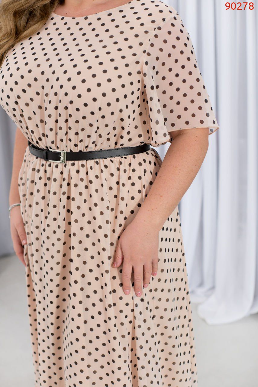 Ця повітряна сукня з легкого шифону створює враження легкості та грації. Вона має півкруглий виріз горловини та відрізну лінію талії, яка спадає плісованими оборками, надаючи образу ніжності. Сукня складається з двох шарів тканини: верхній шар – напівпрозорий шифон, а нижній – м’який та приємний на дотик, що дарує комфорт протягом усього дня. Рукава короткі та вільні, що забезпечує ще більшу повітряність і зручність. Для додаткового акценту на талії можна використовувати пояс, який входить в комплект. Ця сукня – ідеальний вибір для літньої прогулянки або романтичного побачення, створюючи образ ніжної та витонченої жінки.