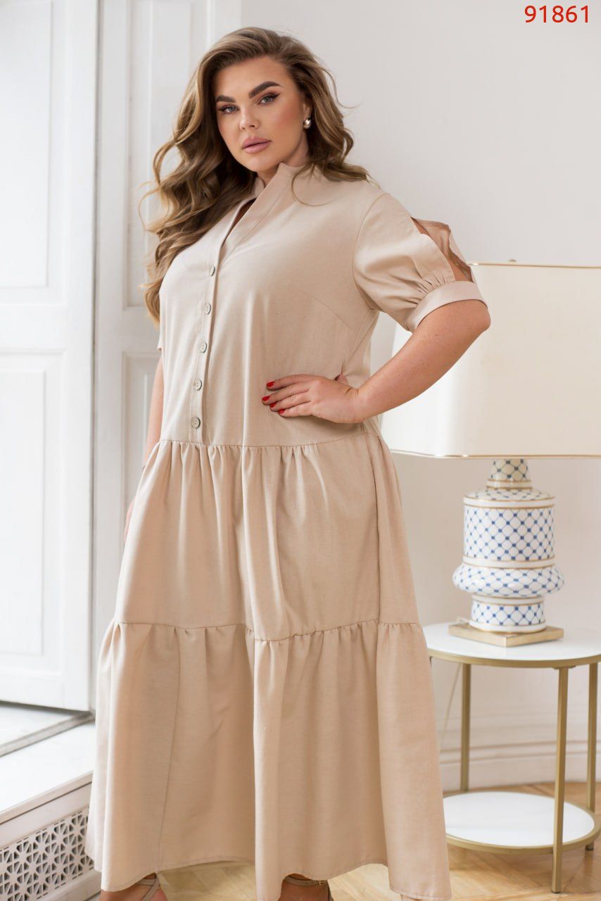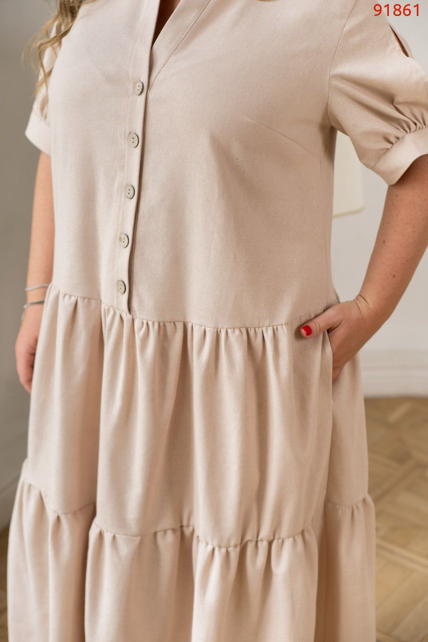 Легка, дихаюча та така стильна – ця лляна сукня стане твоїм улюбленим варіантом на спекотні дні. V-подібний виріз із акуратним комірцем додає образу стриманої жіночності, а ряд ґудзиків спереду – класики з ноткою романтики. Рукави – окрема любов: з розрізами та манжетами, вони виглядають дуже цікаво й дарують свободу рухів. Відрізна спідниця з кількох м’яких воланів створює легкий, живий силует, який красиво колихається на вітрі. Ця сукня – ідеальна для прогулянок, подорожей або просто щоб відчути себе особливою навіть у звичайний день.