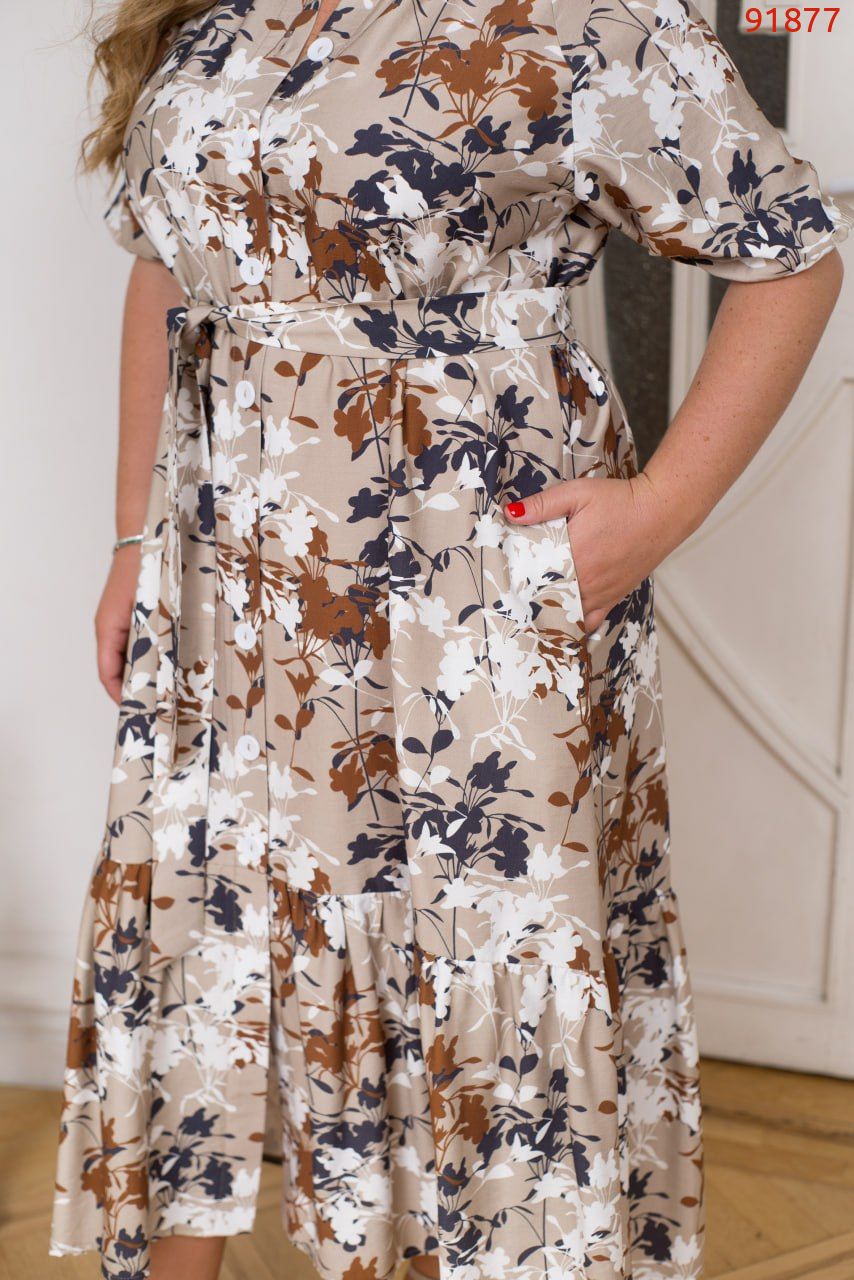 Ця сукня – про ніжність, комфорт і жіночність в одному образі. Максі-довжина, легкий волан по подолу та делікатний маленький комір – все це створює дуже гармонійний і витончений силует. Спереду – ряд ґудзиків, тож можна регулювати глибину вирізу як хочеш. Короткі рукави з м’якою резинкою на манжетах – зручно, нічого не тисне. А ще є кишені в бокових швах (ура практичності!) і текстильний пояс, який красиво підкреслює талію. Ця сукня точно стане твоїм улюбленим варіантом і на кожен день, і на особливі моменти