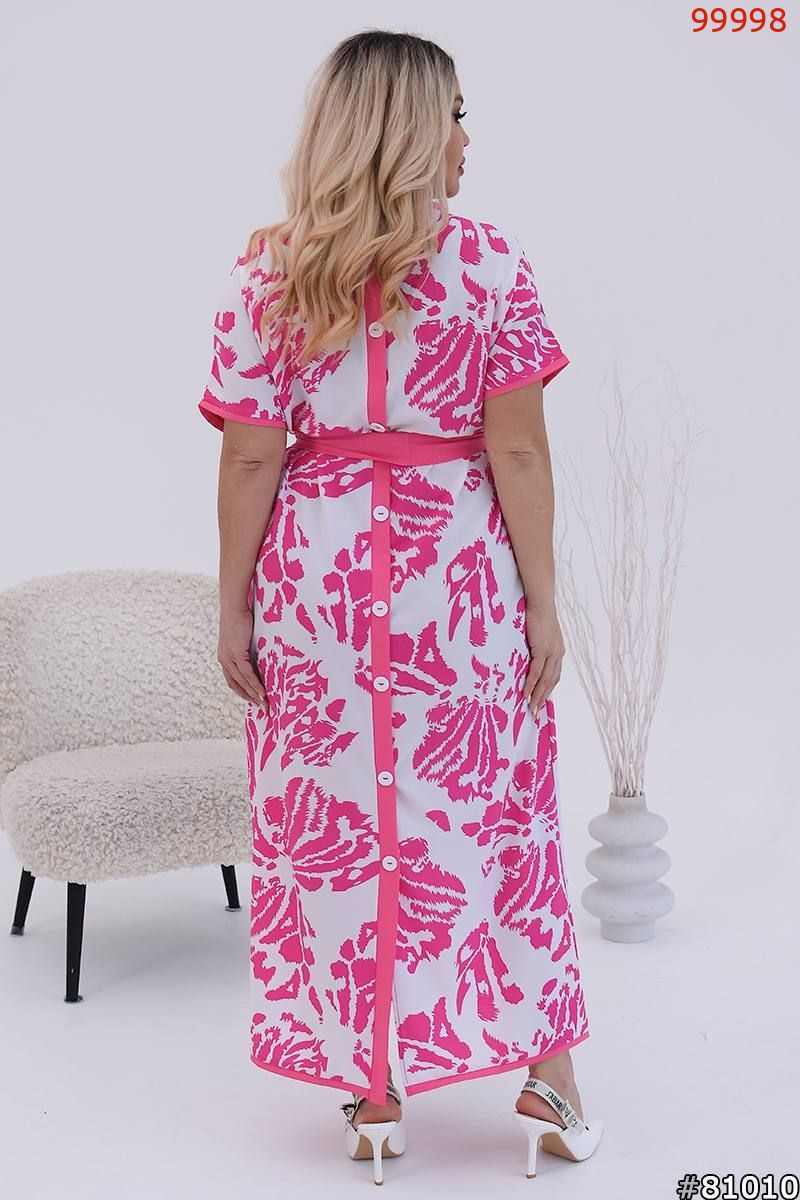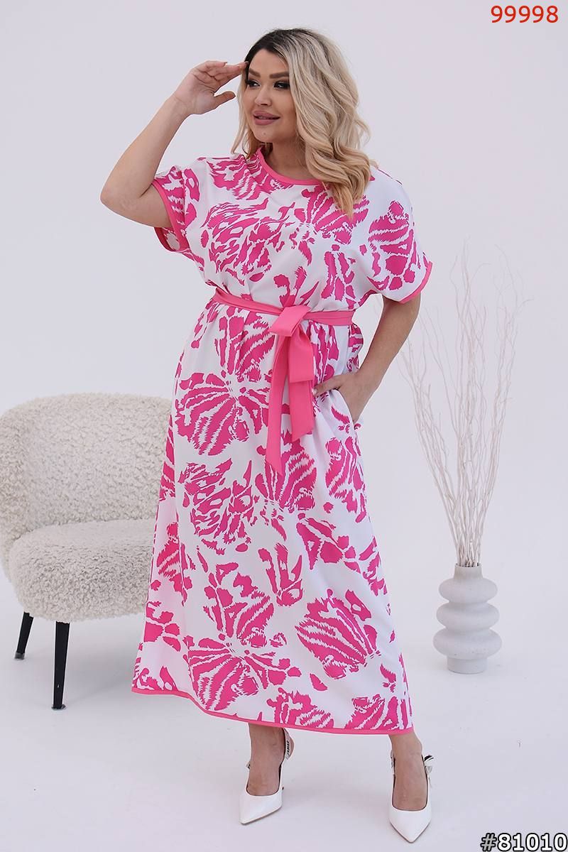 Сукня виконана з яскравим абстрактним принтом. Модель вільного крою з короткими рукавами та округлим вирізом горловини. Рукави та горловина мають окантовку в тон принта, що додає контрастного акценту. Талія підкреслена широким поясом, що зав'язується на бант, що робить силует жіночнішим. Довжина сукні – максі, що надає образу елегантності. Вбрання відмінно підійде для літніх прогулянок та заходів, поєднуючи комфорт та стиль