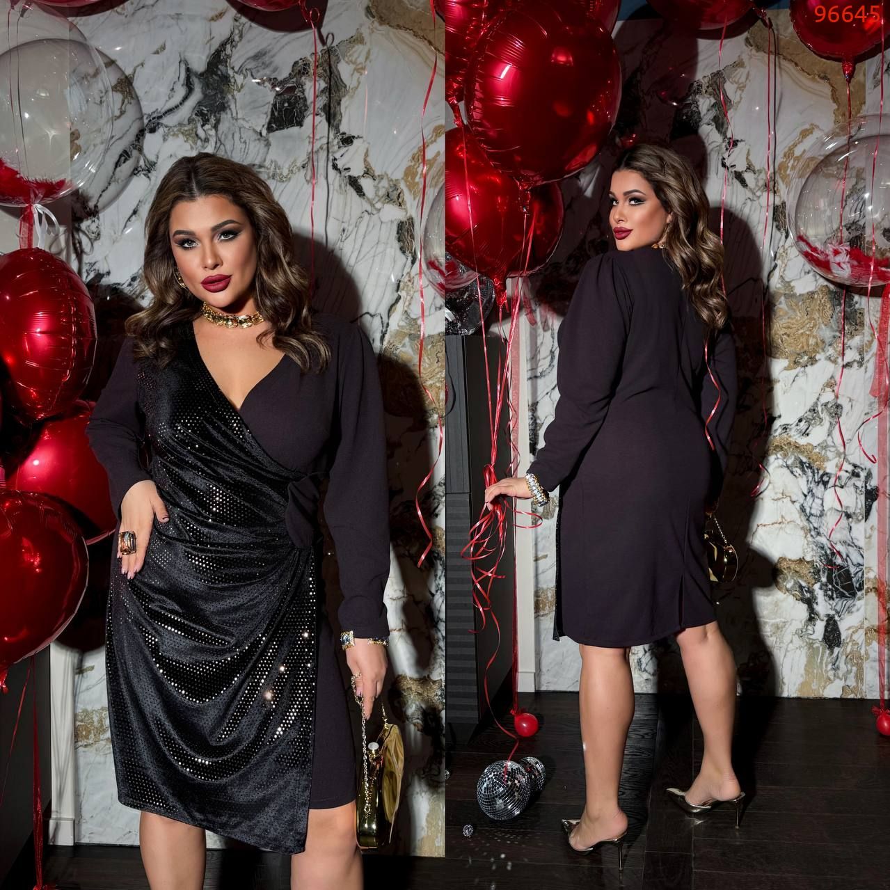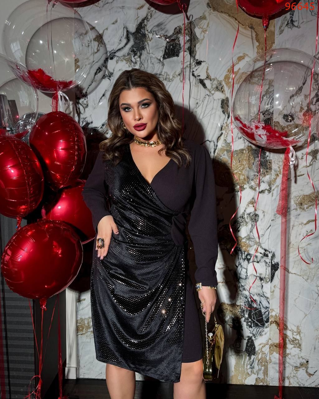Стильна сукня з ефектним поєднанням креп-дайвінгу та бархату з блискітками. Модель м’яко підкреслює фігуру, має комфортну посадку та довгі рукави – ідеальний вибір для святкових подій.