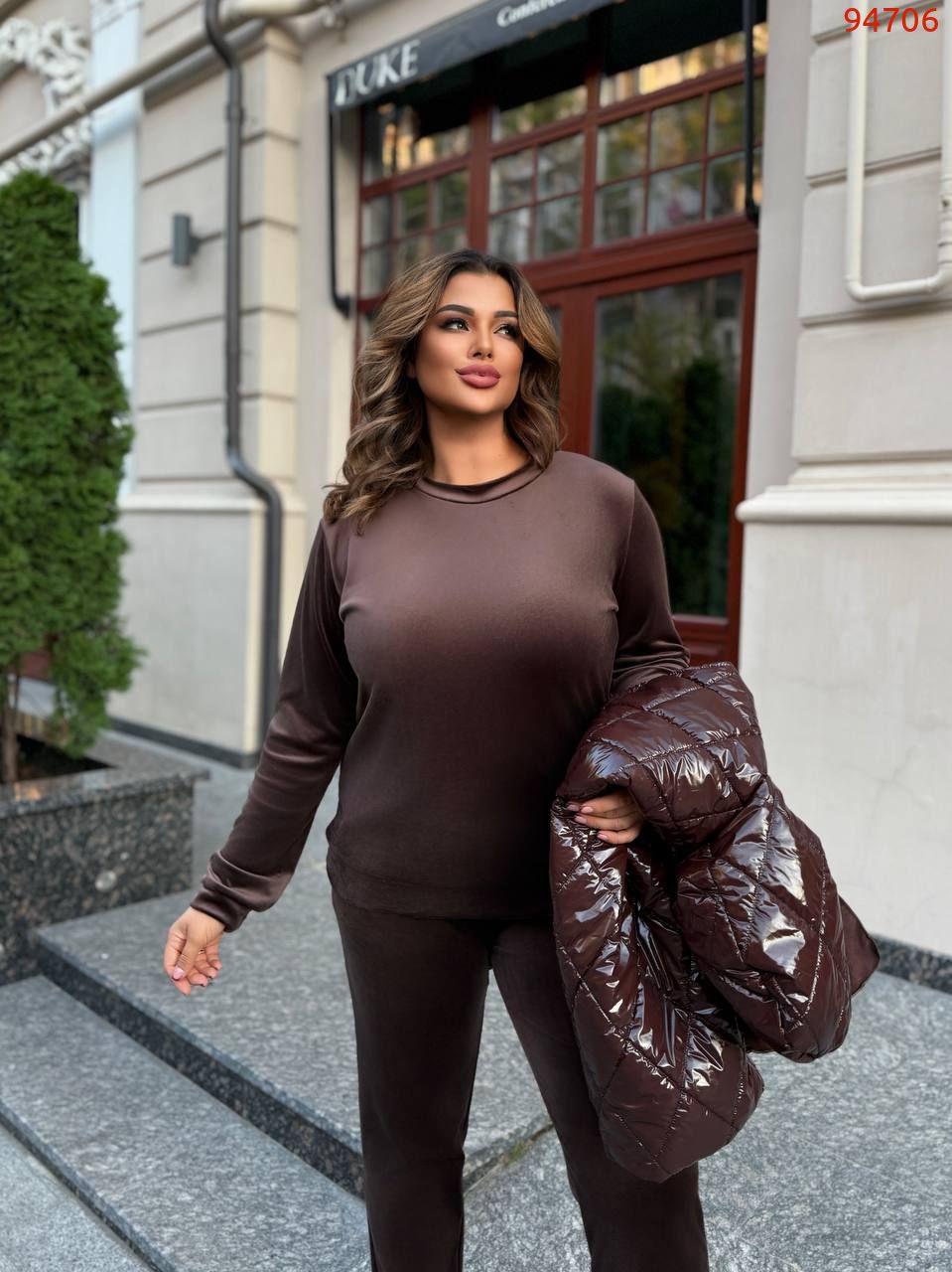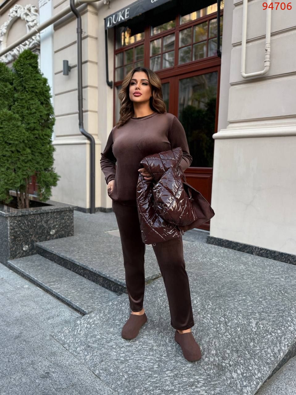 Розкіш у кожній деталі. М’який благородний блиск велюру робить цей костюм особливим – він ніби створений для вечорів, коли хочеться бути в центрі уваги. Глибока фактура тканини грає на світлі, додаючи образу шарму та вишуканості. Це вибір для тих, хто цінує комфорт і любить привертати погляди.