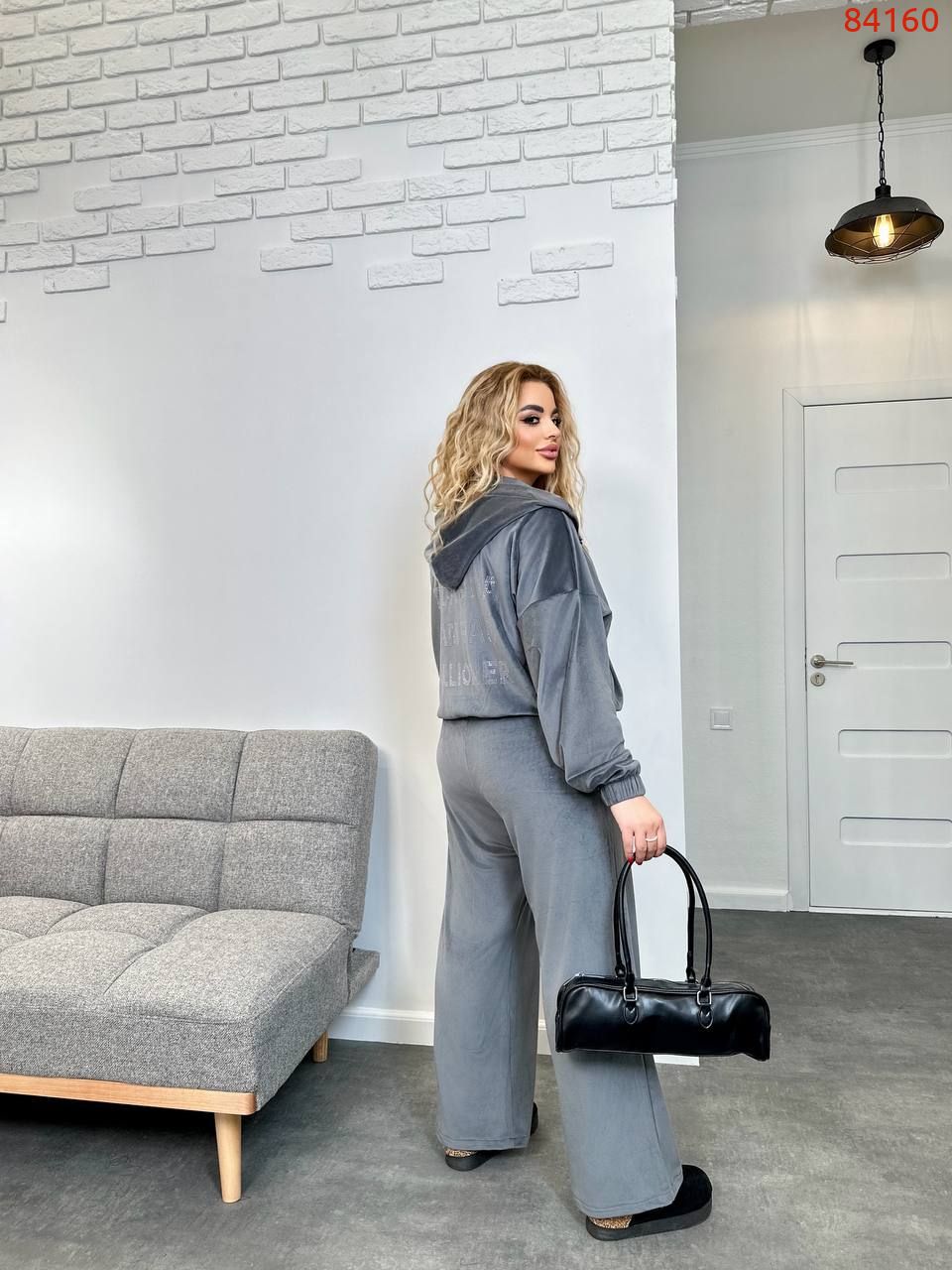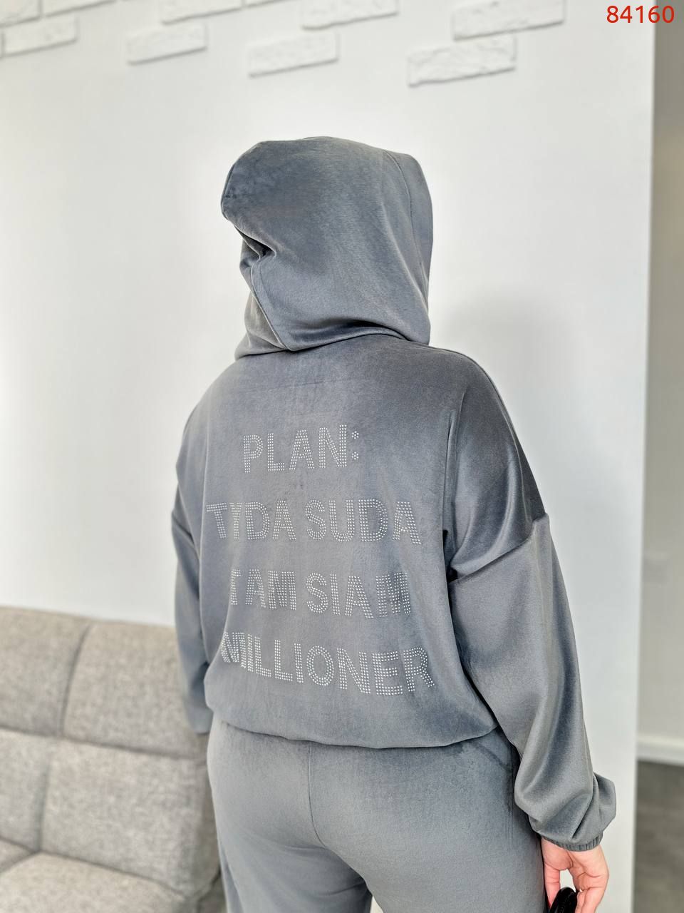 Костюм із батальної серії виглядає дуже стильно завдяки поєднанню матеріалів та дизайну. Велюрова тканина, щільна та приємна на дотик, додає образу елегантності, а хутряна підкладка забезпечує комфорт і тепло. Актуальний напис зі стразів на спині додає модного акценту, привертаючи увагу до деталей. Широкі штани-палаццо та об’ємний верх створюють сучасний і розслаблений силует, який підходить як для спортивного, так і для повсякденного образу.