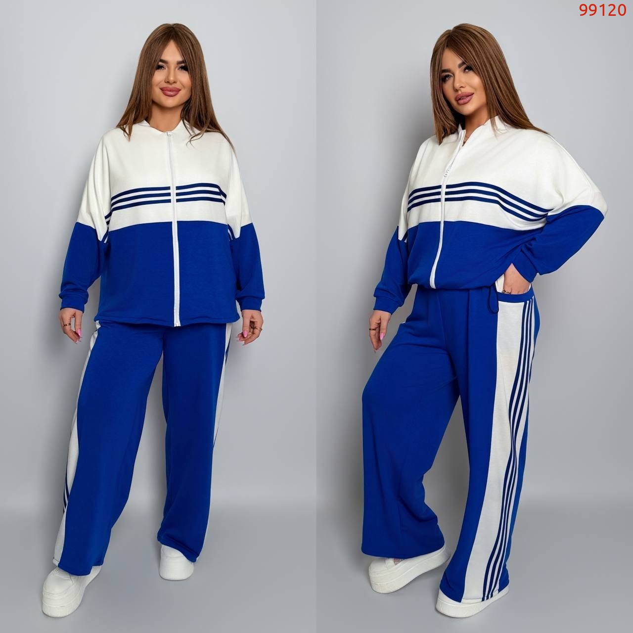 Довжина штанів : 106 см Штани з ломпасом , з високою посадкою , пояс на гумці , бічні кишені . Кофта прямого покрою , з ломпасом , низ на фіксаторі , на блискавці .