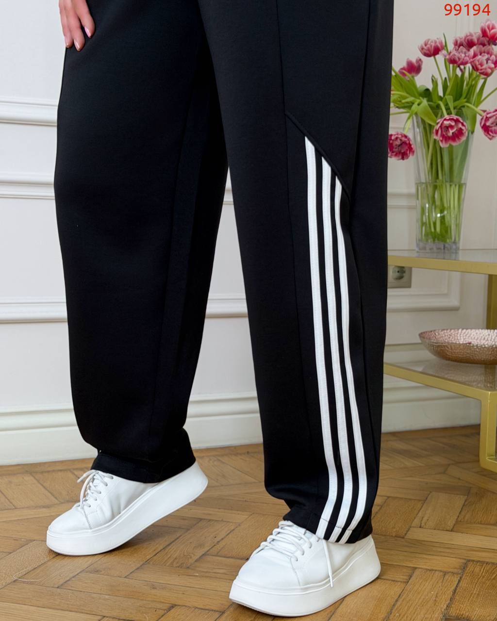 Штани - вільна комфортна посадка , прямі, еластичний пояс на резинці, бокові кишені, декоративні вставки з лампасами в нижній частині.