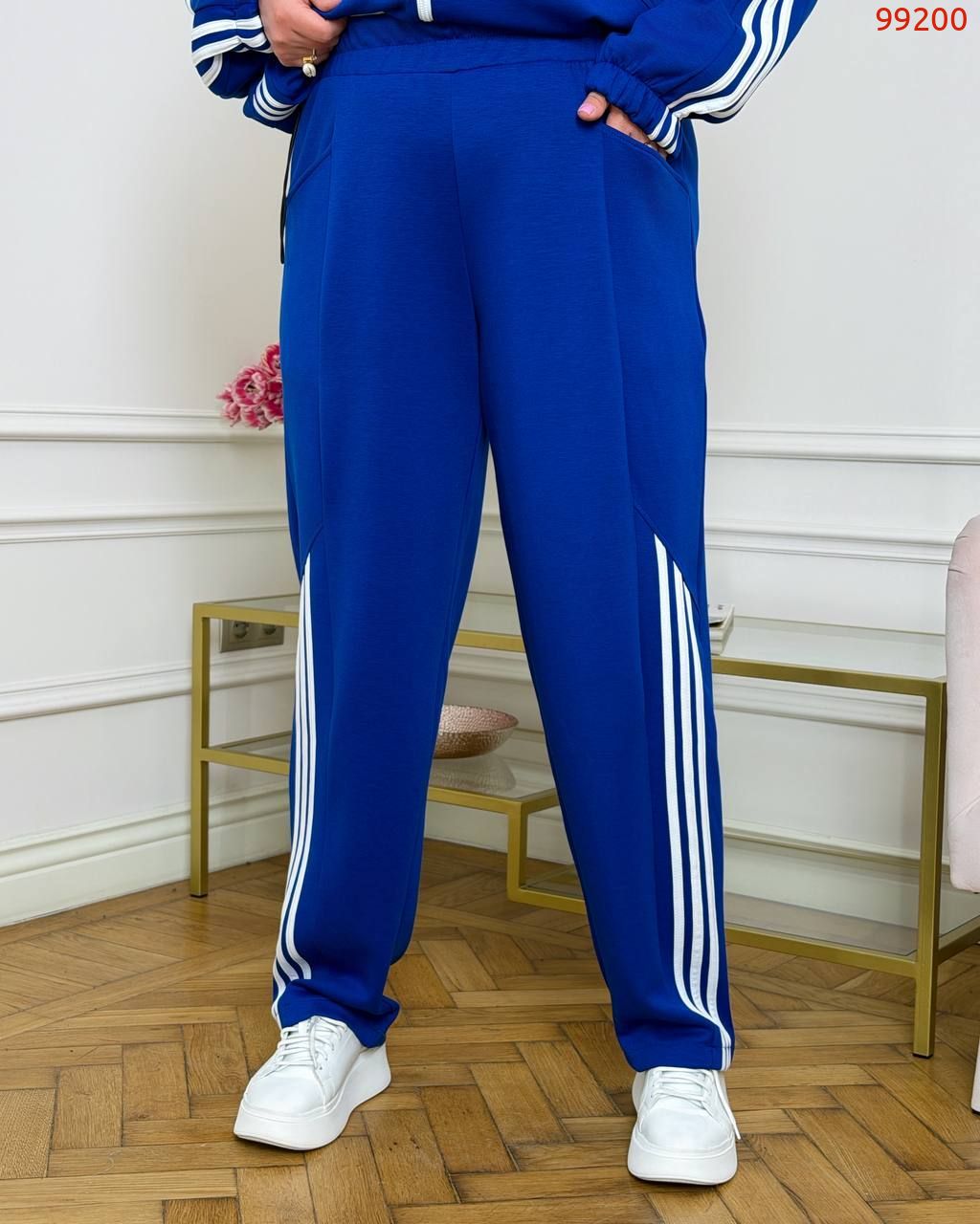 Штани - вільна комфортна посадка , прямі, еластичний пояс на резинці, бокові кишені, декоративні вставки з лампасами в нижній частині.